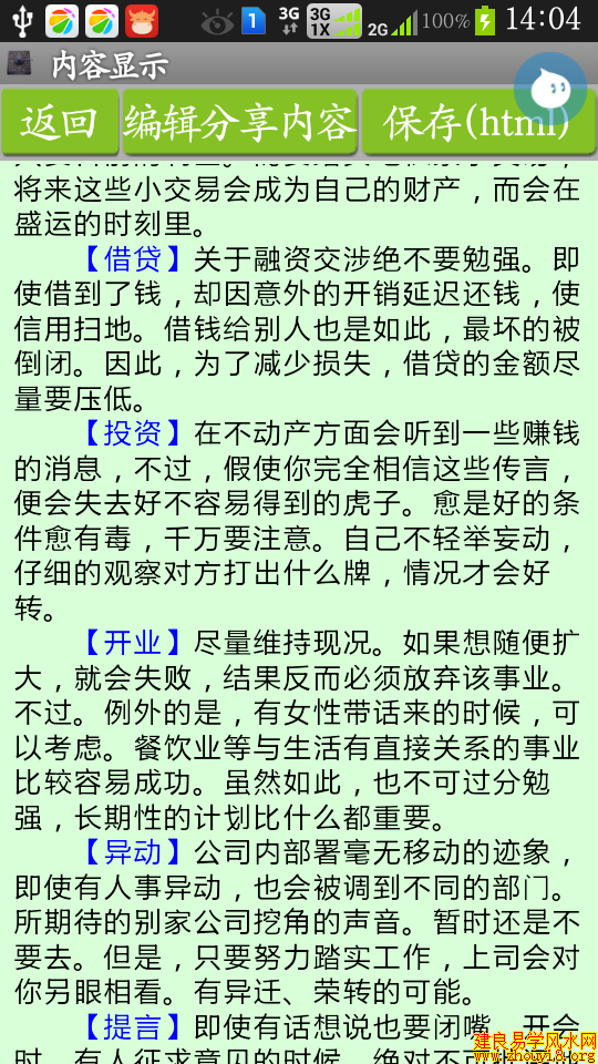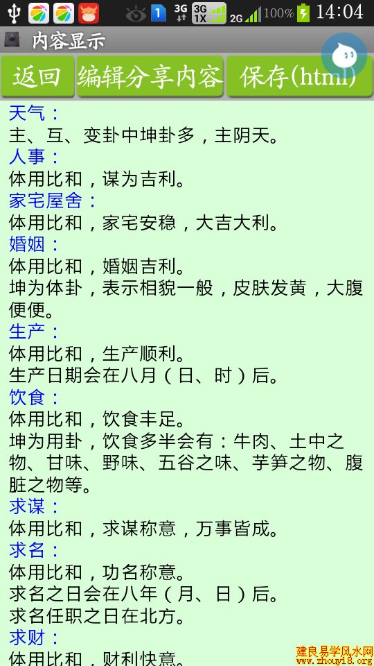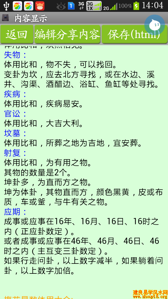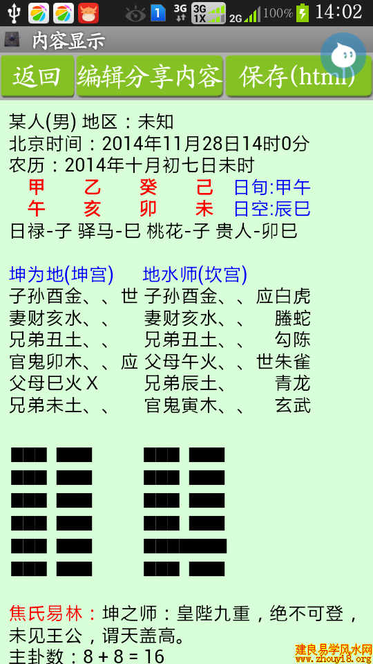 坤为地 之 地水师 主卦数: 8+8=16 主变卦卦数:8+8+8+6=30 焦氏易林:坤之师:皇陛九重,绝不可登,未见王公,谓天盖高。 体用关系:体用比和,体用皆衰。 坤卦卦辞为: 《坤》:元亨,利牝马之贞。君子有攸往,先迷后得主,利,西南得朋,东北丧朋。安贞,吉。《彖》曰:至哉坤'元',万物资生,乃顺承天。坤厚载物,德合无疆。含弘光大,品物咸'亨'。'牝马'地类,行地无疆,柔顺'利贞'。'君子'攸行,'先迷'失道,'后'顺'得'常。'西南得朋',乃与类行。'东北丧朋',乃终有庆。'安贞'之'吉',应地无疆。《象》曰:地势坤,君子以厚德载物。 动爻爻辞为: 六二:直方,大不习,无不利。《象》曰:'六二'之动,'直'以'方'也。'不习无不利',地道光也。 梅花易数分类占: 天气: 主、互、变卦中坤卦多,主阴天。 人事: 体用比和,谋为吉利。 家宅屋舍: 体用比和,家宅安稳,大吉大利。 婚姻: 体用比和,婚姻吉利。 坤为体卦,表示相貌一般,皮肤发黄,大腹便便。 生产: 体用比和,生产顺利。 生产日期会在八月(日、时)后。 饮食: 体用比和,饮食丰足。 坤为用卦,饮食多半会有:牛肉、土中之物、甘味、野味、五谷之味、芋笋之物、腹脏之物等。 求谋: 体用比和,求谋称意,万事皆成。 求名: 体用比和,功名称意。 求名之日会在八年(月、日)后。 求名任职之日在北方。 求财: 体用比和,财利快意。 交易: 体用比和,交易易成。 出行: 体用比和,出行顺利。 体为坤卦,自己被动出行。 行人: 体用比和,归期不远。 谒见: 体用比和,欢然相见。 失物: 体用比和,物不失,可以找回。 变卦为坎,应去北方寻找,或在水边、溪井、沟渠、酒醋边、浴缸、鱼缸等处寻找。 疾病: 体用比和,疾病易安。 官讼: 体用比和,大吉大利。 坟墓: 体用比和,所葬之地为吉地,宜安葬。 射复: 体用比和,为有用之物。 其物的数量是2个。 坤卦多,为直而方之物。 坤为体卦,其物直而方,颜色黑黄,皮或布质,车或釜,与牛有关之物。 应期: 成事或应事在16年、16月、16日、16时之内(正应卦数定)。 或者成事或应事在46年、46月、46日、46时之内(主互变三卦数定)。 如果行走问卦,以上数字减半,如果躺着问卦,以上数字加倍。 梅花易数体用大全: 岁运:忠厚待人,可得人和与财利,戒烟酒为佳。 身体:胃肠病 、肾结石、糖尿病,往南方诊治。 婚姻:无法虚心接纳对方的建议,婚姻难成。 事业:不可扩大经营,宜守,稳定可得财利。 六甲:生女,冬占生男,水土不服小心饮食。 考试:少改变主意为妙,在录取边缘应多努力。 失物:在炉灶旁或浴厕内找找,外流往北方水边。 寻人:往北方水边或郊区农田、空屋找找看。 出行:如期外出,少变动为佳。 诉讼:稍有变化,诚实对待可胜诉。 天候:阴雨不定。 预测:可得财利,戒除烟酒为佳,肾结石。 应期:凶应于春甲乙寅卯日。 易学入门断卦: 坤为地 坤,元亨,利牝马之贞。坤是地,西南之意。上卦、下卦都是地的全阴的卦。充满了毫无光辉的气,运势停滞。卦性卑。在南西方能够得到光明,不过难局会出现。相反地,在东北方面虽然会失去光明,却有德义之庆。只要致力于柔和,从顺,与自己身份相称的愿望,便能如愿以偿。牝马是所有兽类中最从顺者,亦即借用女性的力量可能成功的意思。 坤为地,无论看什么地方都是无光的谷底运势,但是,并非没有出口。就如同暴风雨会过去一样,经过一段时间。虽然慢,运势还是会上升。因此务必要有宽大的心胸,采取等待的姿势。 一切的人事,只要诚实的去对待,就能避开困难,每天过着平稳无事的日子。不要谈自己,而要安于辅佐的角色,这一点很重要。急切只会带来反效果,甚至会掉入更深的陷阱。 【买卖】虽然自以为谈得很好而开始交易,最后却没有什么利益。大的契约由于难成,即使成立也有触礁的可能性。现在不要只要目前的利益。而要踏实地积累小交易,将来这些小交易会成为自己的财产,而会在盛运的时刻里。 【借贷】关于融资交涉绝不要勉强。即使借到了钱,却因意外的开销延迟还钱,使信用扫地。借钱给别人也是如此,最坏的被倒闭。因此,为了减少损失,借贷的金额尽量要压低。 【投资】在不动产方面会听到一些赚钱的消息,不过,假使你完全相信这些传言,便会失去好不容易得到的虎子。愈是好的条件愈有毒,千万要注意。自己不轻举妄动,仔细的观察对方打出什么牌,情况才会好转。 【开业】尽量维持现况。如果想随便扩大,就会失败,结果反而必须放弃该事业。不过。例外的是,有女性带话来的时候,可以考虑。餐饮业等与生活有直接关系的事业比较容易成功。虽然如此,也不可过分勉强,长期性的计划比什么都重要。 【异动】公司内部署毫无移动的迹象,即使有人事异动,也会被调到不同的部门。所期待的别家公司挖角的声音。暂时还是不要去。但是,只要努力踏实工作,上司会对你另眼相看。有异迁、荣转的可能。 【提言】即使有话想说也要闭嘴。开会时,有人征求意见的时候。绝对不可批评他人。反之,上司或同事给你的建议要乖乖的听从,那么,你将来会发觉自己缺乏客观性的观察力,借以此为防患失败与未然。 【会面】虽然已经取得联络,仍无法和对方见面。因为生意上的拜访,对方不在的情形很多。而且一等就是几个小时。为使工作成功,要尽量压制心情,忍一字为第一要决。 【交际应酬】严禁赌博。有关胜负的任何事,无论做那一项均毫无胜算。钓鱼、打高尔夫球等