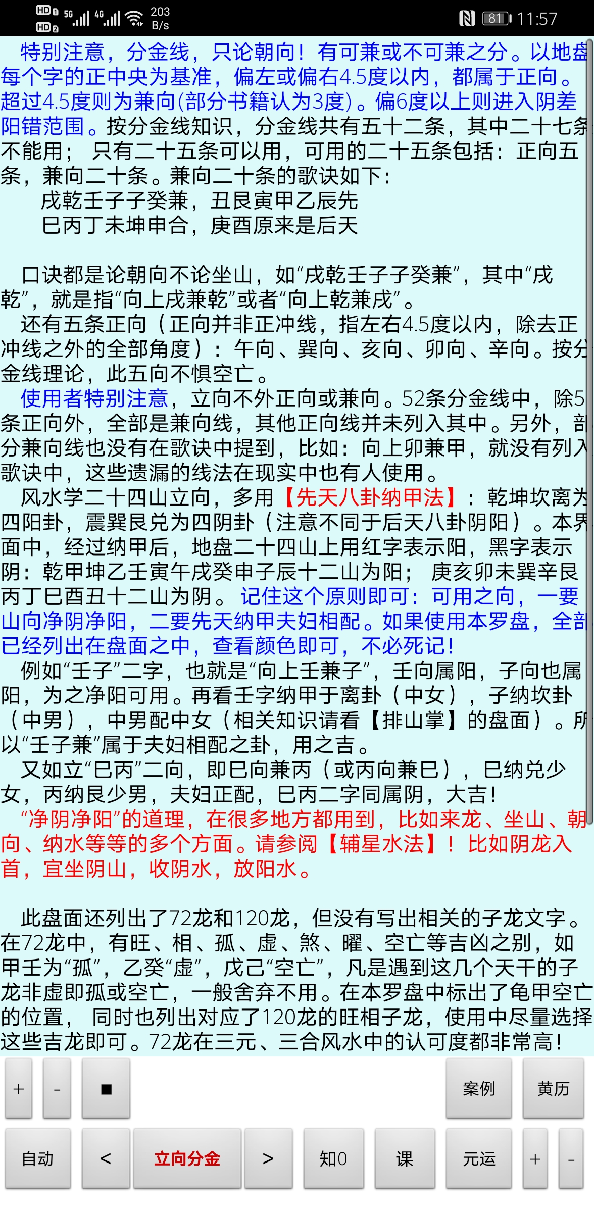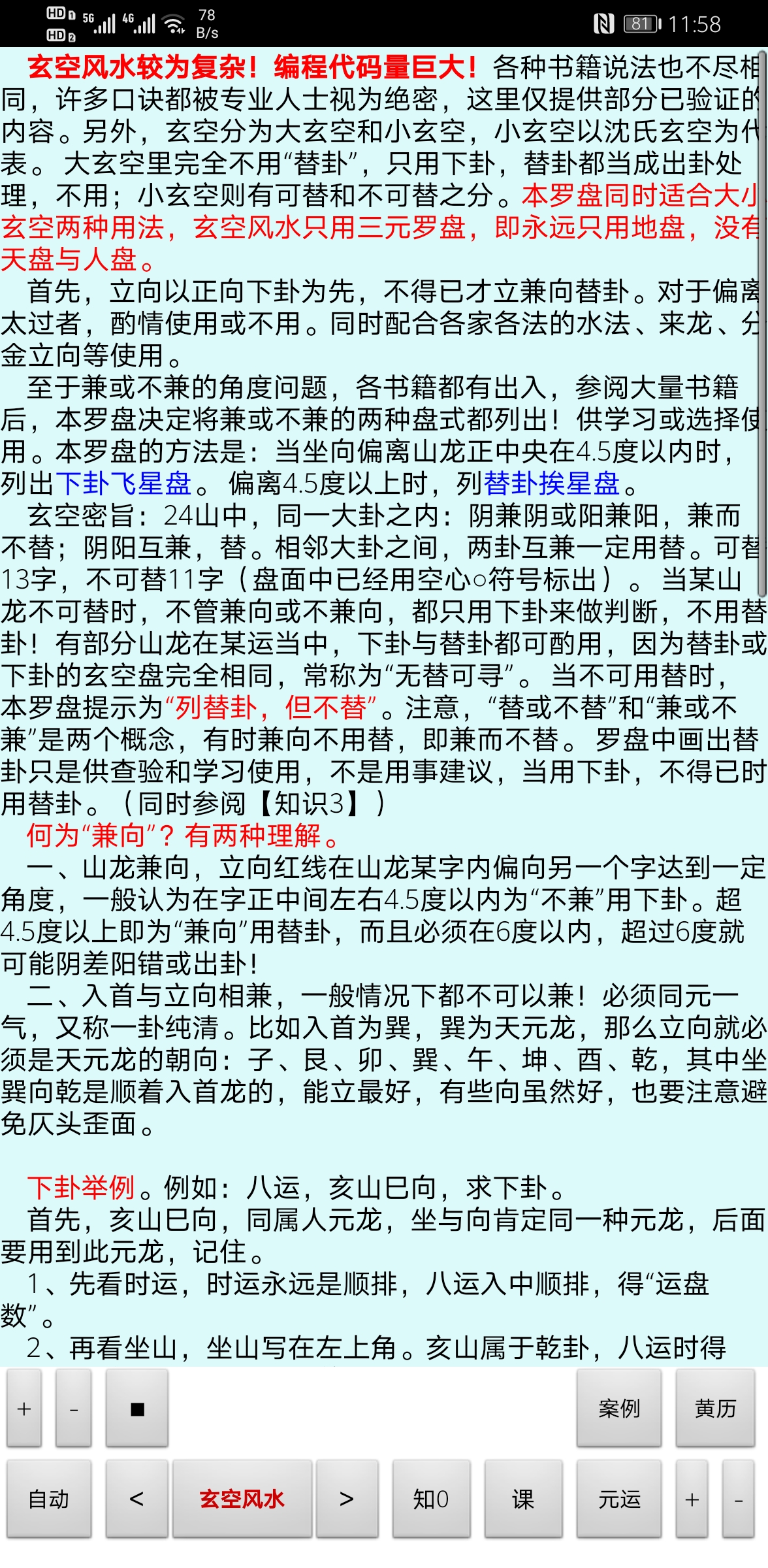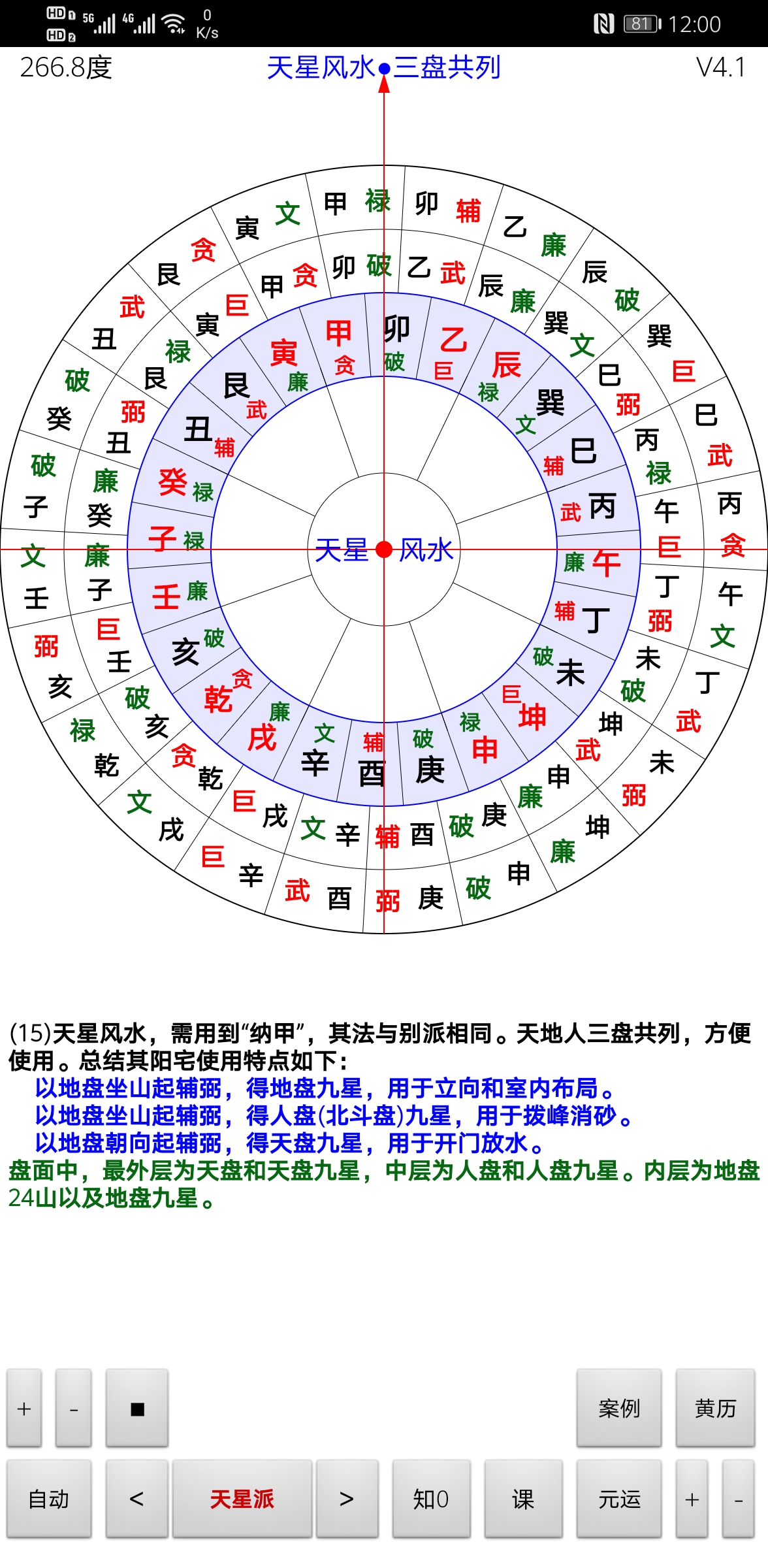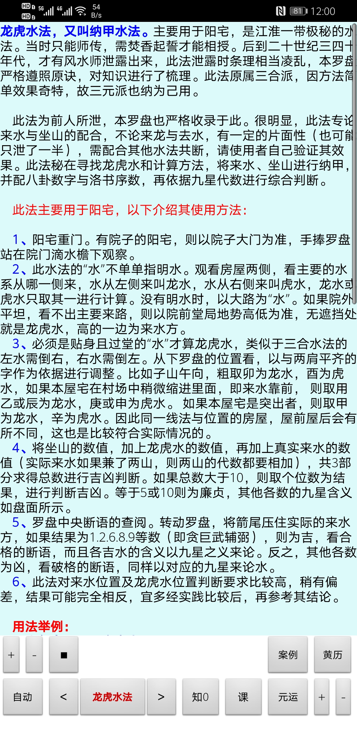 本罗盘软件适应各种分辨率的安卓手机,罗盘中每一个字,第一条线都是由代码生成,绝不是模糊的罗经图片,所以体积很小,界面精准无差!所收集的内容均为业内人士普遍认可的精华方法,比如九星掌、排山掌、辅星掌、立向分金、洪范断宅、玄空风水、 赖公断宅、纳甲择日、玄空择日、抽爻换象、天星风水、四大水口、龙虎水法、三元风水、三合水法、各类神煞等等,融合了三元、三合的内容,同时整合一百二十龙、七十二龙等等内容。