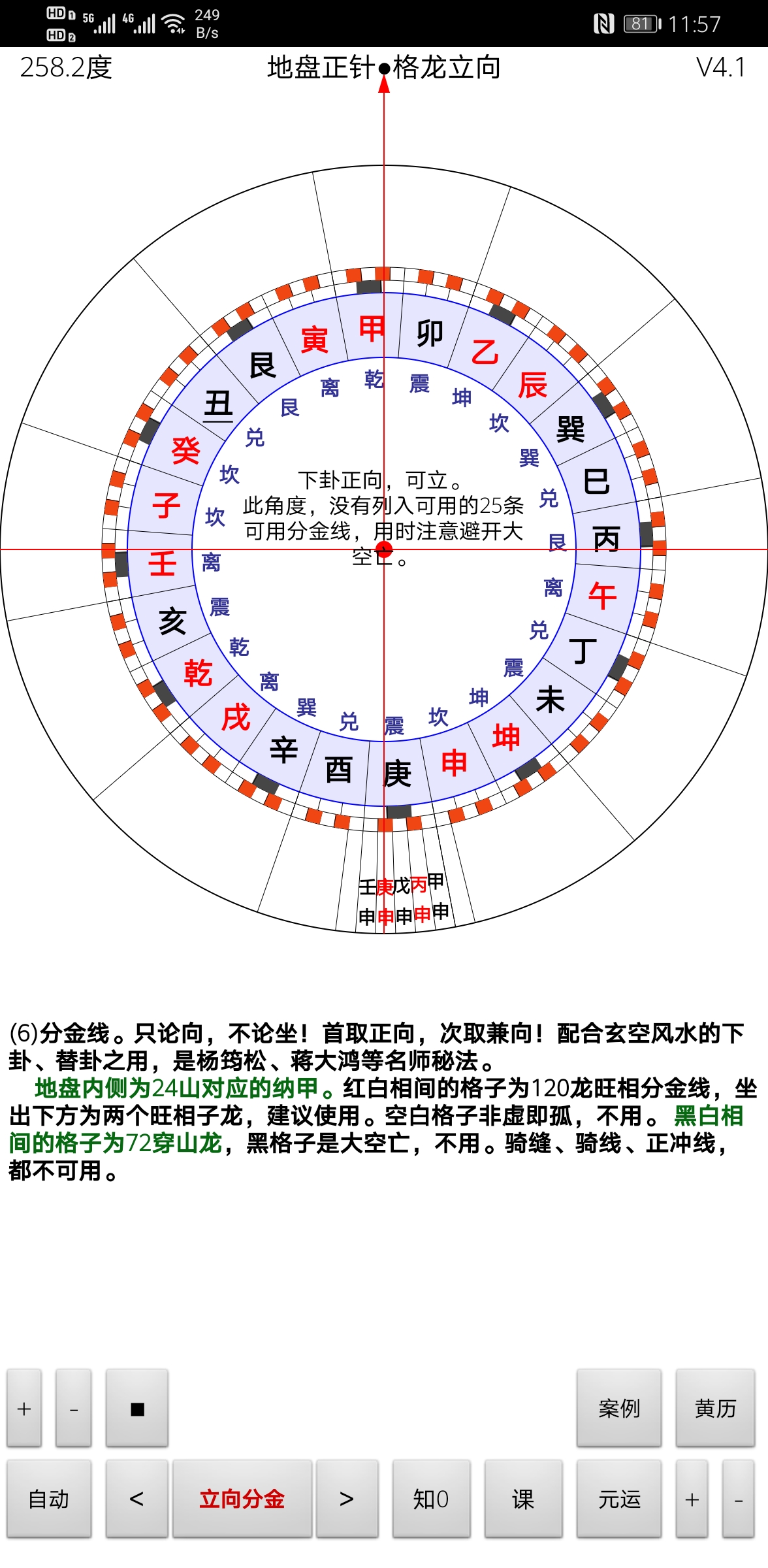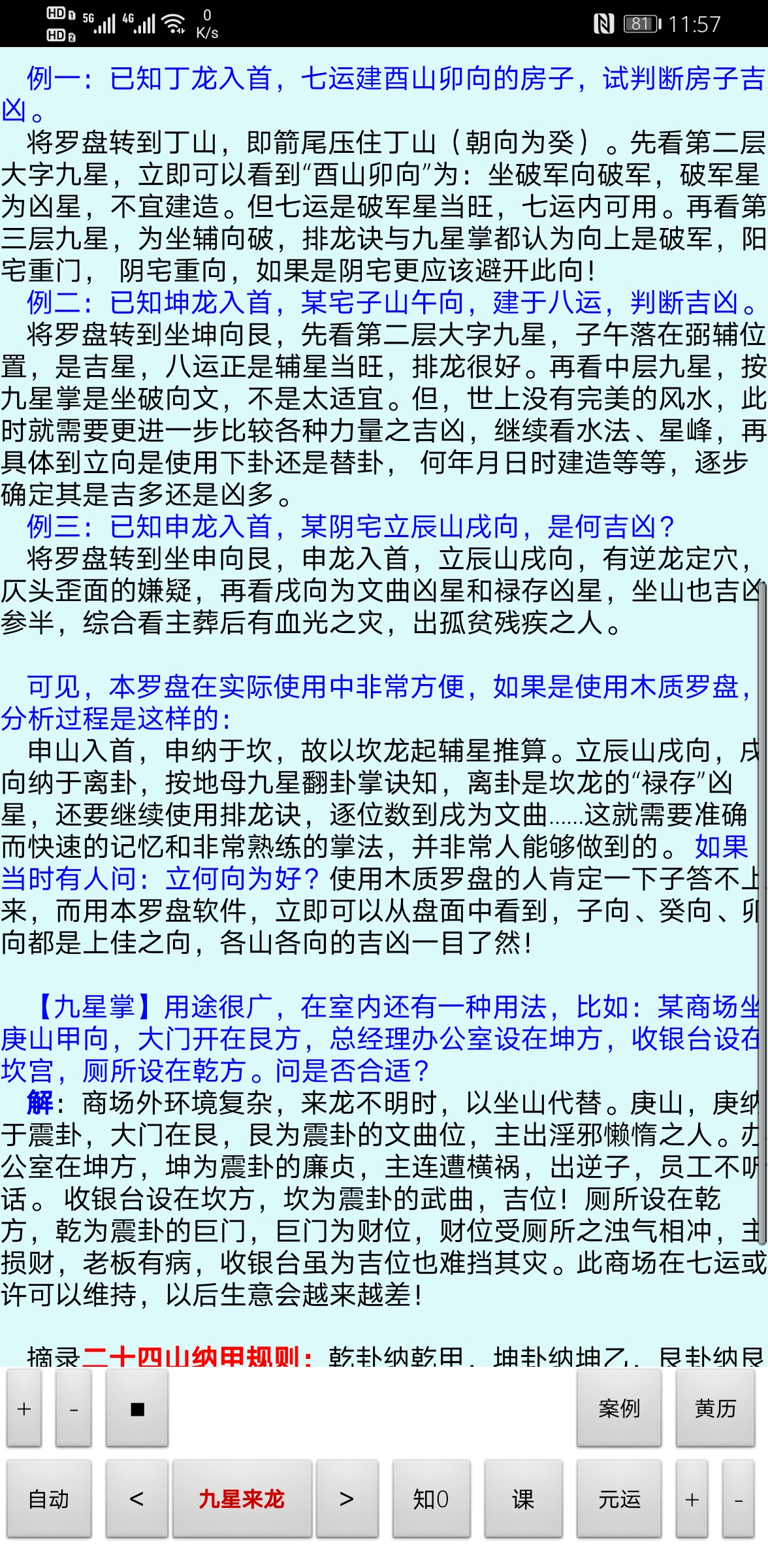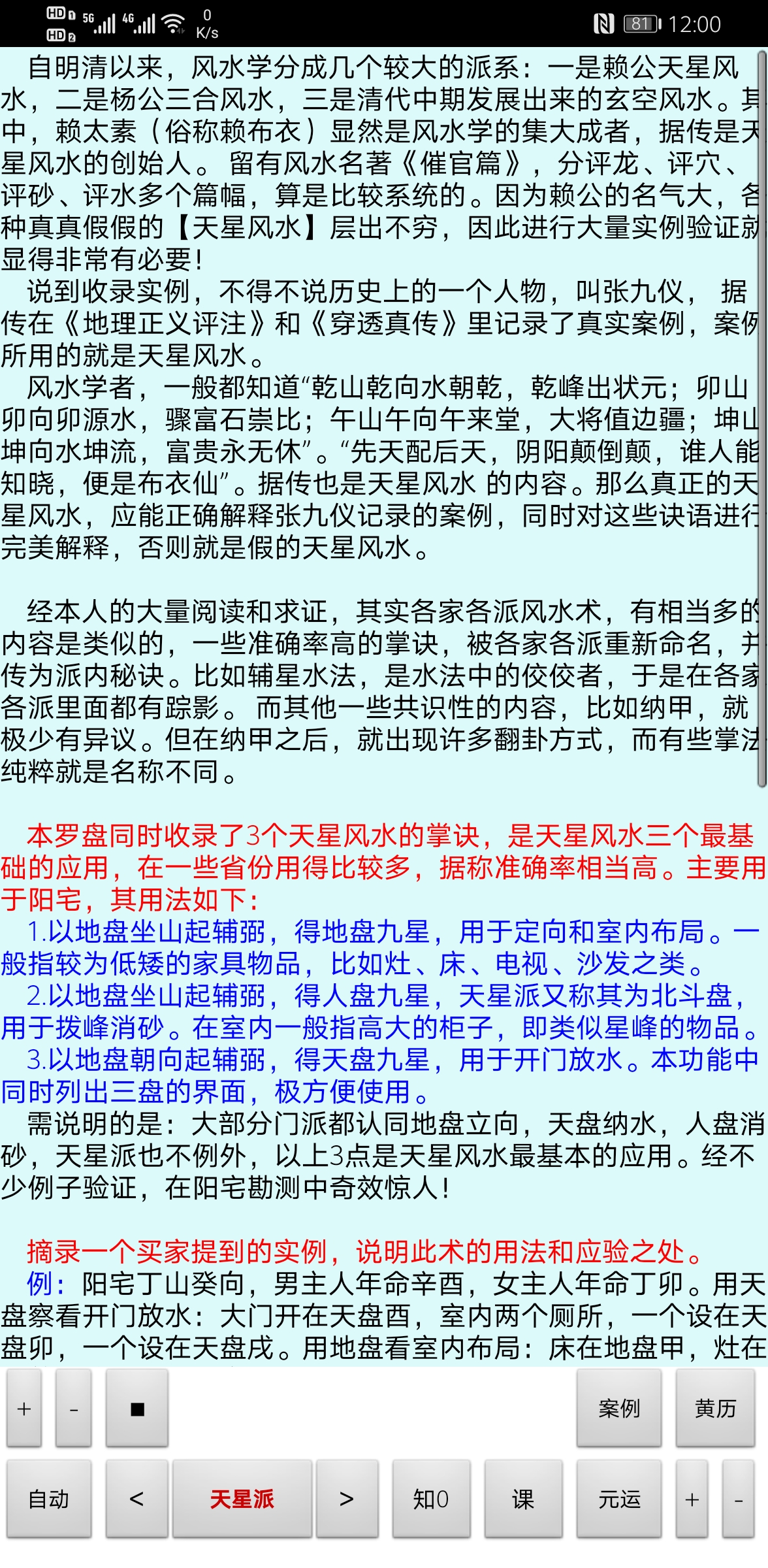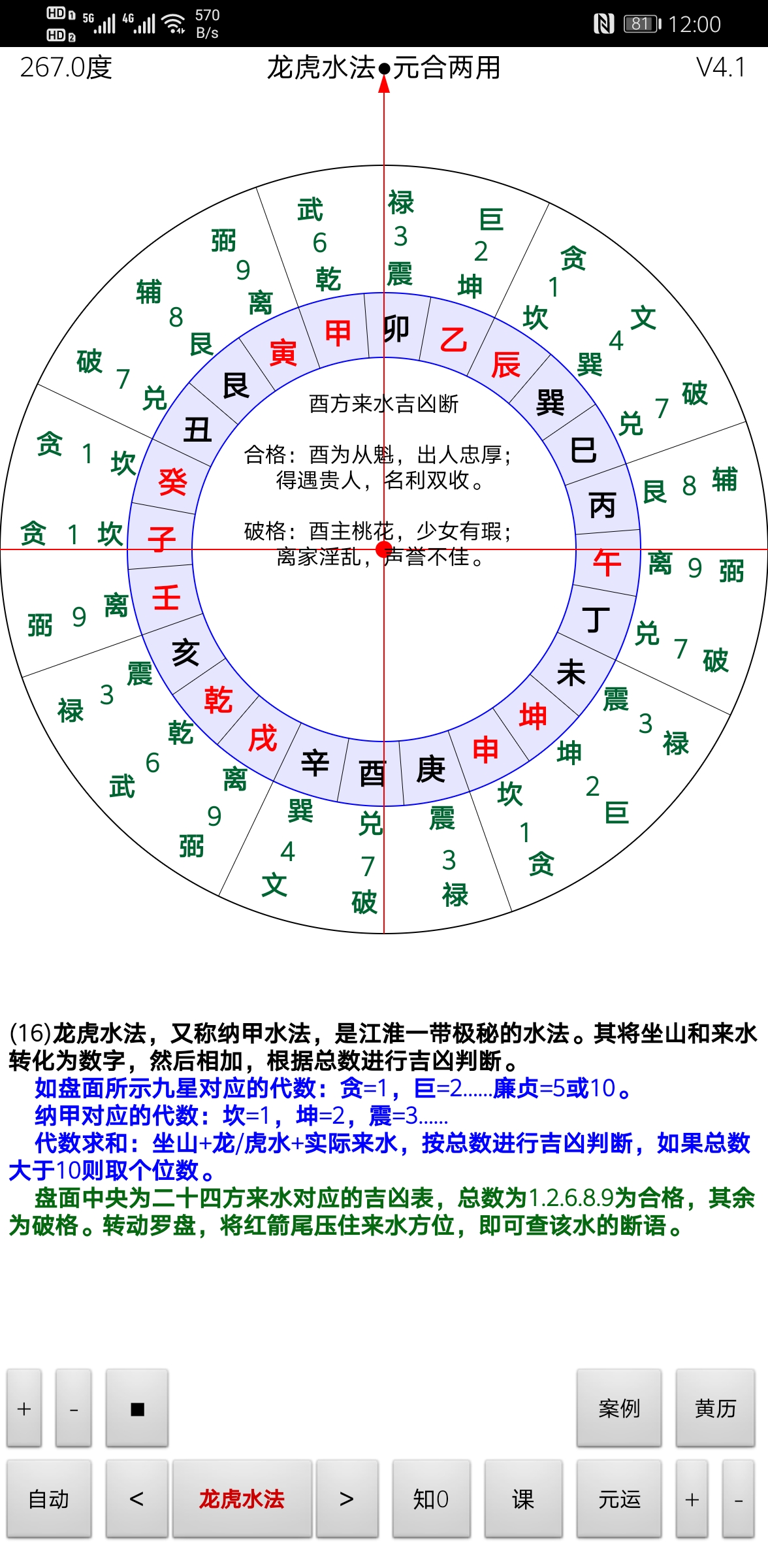 本罗盘软件适应各种分辨率的安卓手机,罗盘中每一个字,第一条线都是由代码生成,绝不是模糊的罗经图片,所以体积很小,界面精准无差!所收集的内容均为业内人士普遍认可的精华方法,比如九星掌、排山掌、辅星掌、立向分金、洪范断宅、玄空风水、 赖公断宅、纳甲择日、玄空择日、抽爻换象、天星风水、四大水口、龙虎水法、三元风水、三合水法、各类神煞等等,融合了三元、三合的内容,同时整合一百二十龙、七十二龙等等内容。