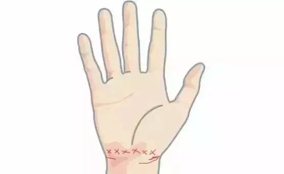 由上而下在手腕线第一条中间出现十字纹(乃财库)的人,当手腕线出现十字纹时,表示此人少年运坎坷,但中年以后运势转好,会经过自己的努力,积累财富,成为有钱人。晚年福禄双全,事事顺利,身体健康。建议在早年多注重经验以及人脉的积累,能成为成功道路之上的助力,晚年更是福禄双全。