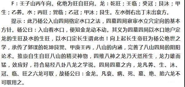 杨公水法,是指唐杨筠松流传下来的测定、调整住宅和坟墓山水方位的风水学问。它是以三元九运挨星理论为基础,用以住宅和坟墓的趋吉避凶。是以先后天八卦为基础理论,以罗盘的二十四山为定向依据;以客观的山水环境和阴阳两宅的为堪察调整对象;特别重视山水与宅之间阴阳“交媾”是杨公水法的特点。操作方法:以三元罗盘为主要工具,以河图数理洛书九星定理气,与山、水、路、屋、树、桥、排水口等相结合,确定旺衰吉凶。 天有风雨雷电四季变换是为天道,地有江河山川地震水患是为地道,人有疾病灾难生死更替是为人道。天地人和谐相处之道暗藏其中,顺则旺,逆则灾。杨公水法体现的主要是空间的因素,其核心价值正在于调整空间,这个空间因素的精髓就是“三元纳甲交媾”。 一、十二长生水法: 水口在:丁未坤申庚酉,生在甲卯,旺在乾亥,墓在丁未。水口在:癸丑艮寅甲卯,生在庚酉,旺在巽已,墓在癸丑。水口在:辛戌乾亥壬子,生在丙午,旺在艮寅,墓在辛戌。水口在:乙辰巽已丙午,生在壬子,旺在坤申,墓在乙辰。此为杨公十二长生水法。如:未山丑向,乙辰方来水,水口在乾亥:辛戌乾亥壬子,生在丙午,旺在艮寅,墓在辛戌,所以乙辰方来水为冠带水论。 二、四大救贫水法: 杨公水法四大局,阴阳四局辰戌丑未四墓库,曰:地户。又曰:水口。凡天造地设的真龙城局必有水口地户。二十四山四十八向。 辰墓;辛龙水局: A;艮寅山坤申向。旺去迎生正生向。右水倒左出乙辰。龙:坤旺;庚临;辛冠;乾沐;壬生;癸养。水:坤生;庚沐;辛冠;乾临;壬旺。 B:丙午山壬子向。生去会旺正旺向。辛龙水局。龙:坤旺;庚临;辛冠;乾沐;壬生;癸养。水:壬旺;乾临;辛冠;庚沐;坤生。左水倒右出乙辰。 C:癸丑山丁未向。正养向。右水倒左出巽巳。龙:坤旺;庚临;辛冠;乾沐;壬生;癸养。水:壬旺;乾临;辛冠;庚沐;坤生;丁养。 D:辛戌山乙辰向。正墓向。左水倒右与右边坤水合襟过堂出巽巳。龙:坤旺;庚临;辛冠;乾沐;壬生;癸养。水:左边乾临,壬旺,右边坤生。 E:乾亥山巽巳向。化死为生自生向。右水倒左出乙辰养位不作冲破养位论。龙:坤旺;庚临;辛冠;乾沐;壬生;癸养。水:癸生;丙沐;丁冠;坤;庚旺。 F:庚西山甲卯向。化绝为旺自旺向。左水倒右出乙辰借库消纳。龙:坤旺;庚临;辛冠;乾沐;壬生;癸养。水:甲旺;艮临;癸冠;壬沐;乾生。 注:阴龙阴向,阳龙阳向。凡自生自旺的龙最有力上应星垣。多为三吉六秀龙。三吉六秀砂水。四垣乾坤艮巽,四庚壬丙。大贵。 丑墓:丁龙金局: A:乾亥山巽巳向。旺去迎生正生向。龙:巽旺;丙临;丁冠;坤沐;庚生;辛养。水;巽生;丙沐;丁冠;坤临;庚旺。右水倒左出癸丑正库。 B:甲卯山庚酉向。生去会旺正旺向。龙:巽旺;丙临;丁冠;坤沐;庚生;辛养。水;庚旺;坤临;丁冠;丙沐;巽生。左水倒右出癸丑正库。 C:辛戌山乙辰向。正养向。龙:巽旺;丙临;丁冠;坤沐;庚生;辛养。水;乙养;巽生;丙沐;丁冠;坤临;庚旺。右水倒左出艮寅绝位。 D:丁未山癸丑向。两水夹出正墓葬向。龙:巽旺;丙临;丁冠;坤沐;庚生;辛养。水;巽生;坤临;庚旺;右水倒左合襟巽生水出艮寅绝位。 E:坤申山艮寅向。化死为生自生向。龙:巽旺;丙临;丁冠;坤沐;庚生;辛养。水;艮生;甲沐;乙冠;巽临;丙旺。右水倒左出癸丑。不作冲破养位论。F:丙午山壬子向。化绝为旺自旺向。龙:巽旺;丙临;丁冠;坤沐;庚生;辛养。水;壬旺;乾临;辛冠;庚沐;坤生。左水倒右了癸丑衰方。 未墓:癸龙木局: A:巽巳山乾亥向。旺去迎生正生向。龙:乾旺;壬临;癸冠;艮沐;甲生;乙养。水;乾生;壬沐;癸冠;艮临;甲旺。右水倒左出丁未木墓。 B:庚酉山甲卯向。生去会旺正旺向。龙:乾旺;壬临;癸冠;艮沐;甲生;乙养。水:乾生;壬沐;癸冠;艮沐;甲旺。左水倒右出丁未正库。 C:乙辰山辛戌向。正养向。龙:乾旺;壬临;癸冠;艮沐;甲生;乙养。水:辛养;乾生;壬沐;癸冠;艮临;甲旺。右水倒左出坤申绝位。 D:癸丑山丁未向。两水夹出正墓向。龙:乾旺;壬临;癸冠;艮沐;甲生;乙养。水;艮临;甲旺;乾生。左水倒右合出坤申绝位。 E:艮寅山坤申向。化死为生自生向。龙:乾旺;壬临;癸冠;艮沐;甲生;乙养。水;坤生;庚沐;辛冠;乾临;壬旺。右水倒左出丁未不作冲破养位论。 三、羊刃禄堂水法: 杨公水法真诀莫不是师承,非师传之真诀,必定被误导,因为历代师者不轻易外传,以上所述也无非是托名杨公的伪作。杨公水法是以真龙真穴为体,消砂纳水为用。若只顾在立穴而收砂收水,不顾龙穴的真假,就落入弃本置末之下乘作法。得不到真龙,砂水皆不为我所用,尽管消砂纳水做得巧夺天工,也是枉然的。一切祸福,皆在龙真穴的、收山出煞上。若是龙不真,穴不的,收不得山来,出不得煞去,“峦头为体,理气为用”是真谛。如果能掌握杨公水法的“羊刃、禄堂”之分,算是初步掌握了杨公风水收放水之法,但其中又有八煞、黄泉,及救贫黄泉等之法,如能正确撑握,富贵荣华尽在期间。杨公水法,精简快捷,真假立辨。雌雄配合,阴阳交媾,就是“杨公水法”的玄关。所谓交媾,就是说物物自具雌雄之性。雌雄与山水之理相应而生旺,如“乾山乾向水流乾,乾峰出状元”是也。 四、正神零神水法: 正神正位装,即要将“龙顶”装在正神位上,正神方位内的山峰要百步始成龙气,而零神方位里的水,则不论其水面的阔狭,水源的长短,只要能低空而不填实,就可论为吉祥。山龙是如此用法,水龙也是