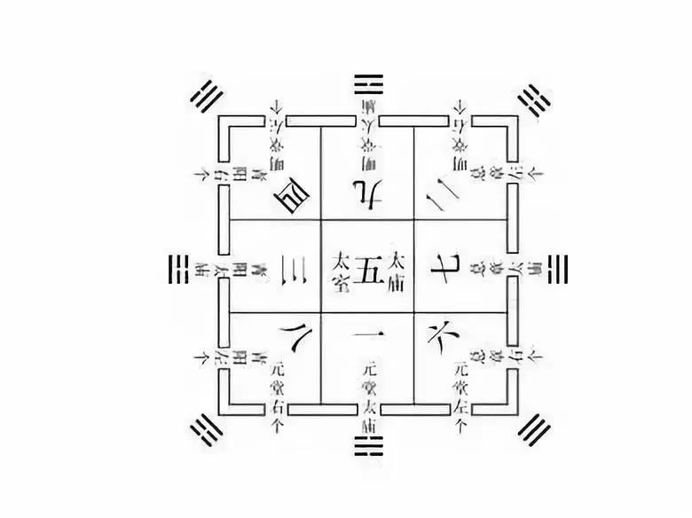 后天八卦:坎一,坤二,震三,巽四,中宫五,乾六,兑七,艮八,离九。