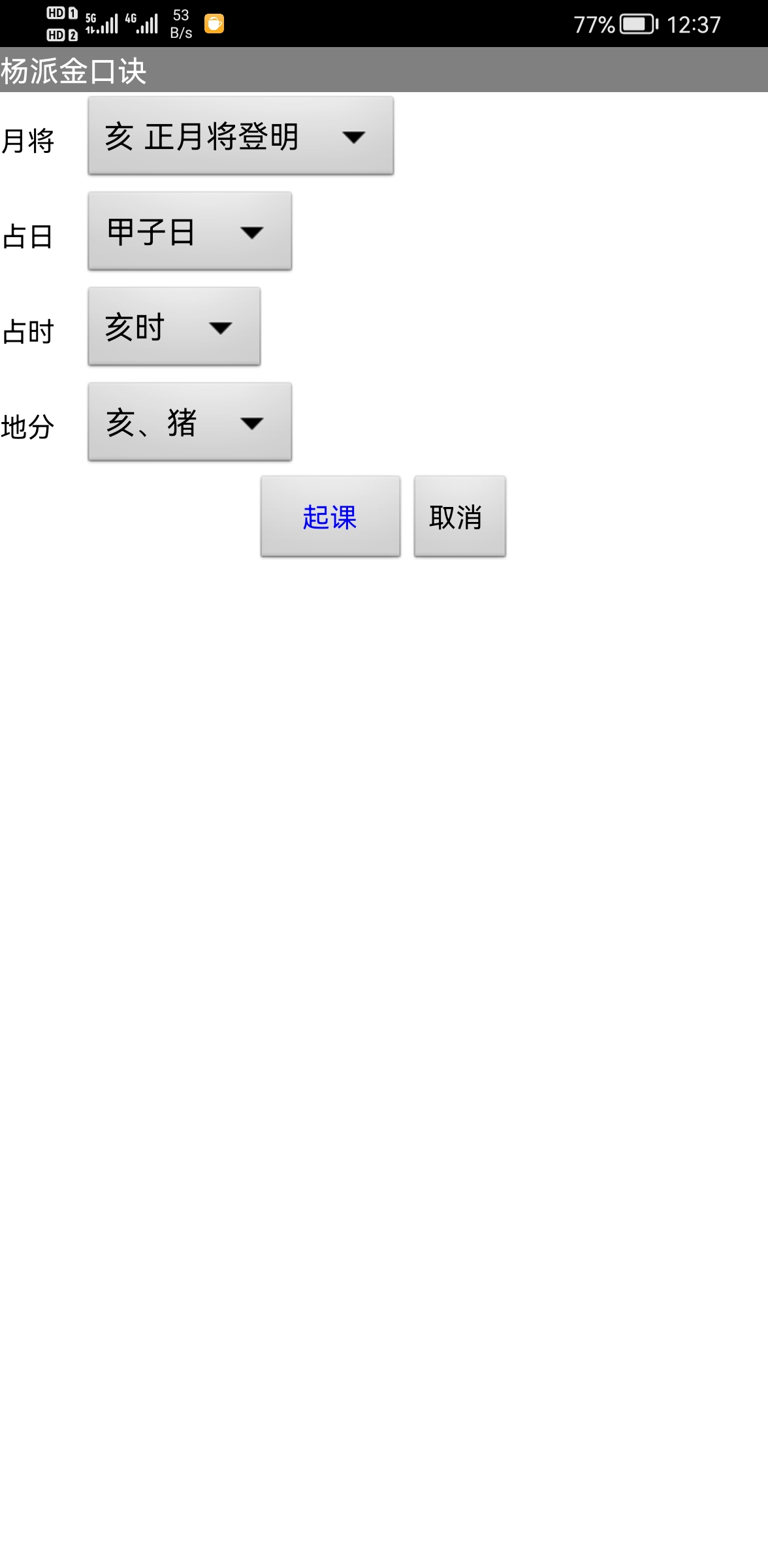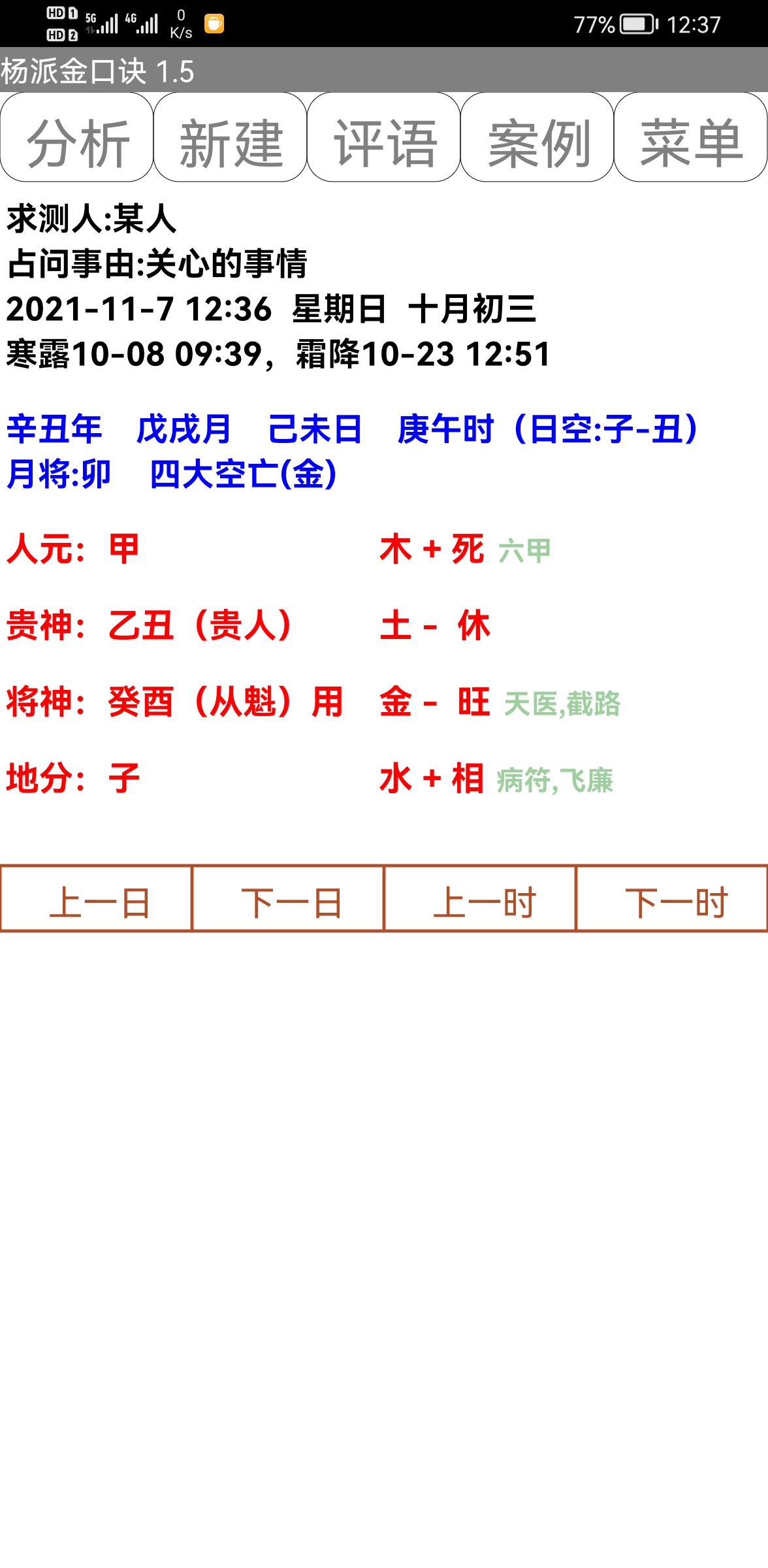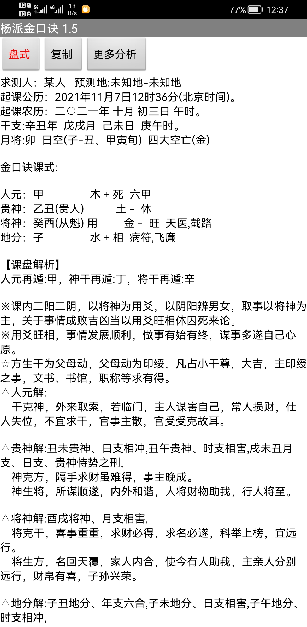手机安卓系统\鸿蒙系统均可使用 售价:150元 有需要者加微信gn413168 软件说明: 1:运行环境:手机安卓系统\鸿蒙系统均可使用 2:本软件为绿色软件,安装软件时只完成复制,卸载时直接删除,不会往你的系统文件夹拷入文件,不会 修改注册表,请放心使用,不带任何插件。 3:本软件为共享软件,未注册有功能限制,但没有时间限制。注册后你可以使用所有功能,并且享受软件 日后的免费升级,和使用时作者亲自提供的技术支持。 4:你可以分发、传播这个软件,但作者拥有对软件的所有权。请不要对它进行反汇编、破解,谢谢你的合 作。 ================================================================ ※ 杨派金口诀 1.5 正式版 ※ 金口诀是周易预测学的一个分支,由于其学习资料少,令很多易学爱好者不得其门而入,利用此款 软件不但可排出课盘,还有适当的断语可供参考,并可预测财运、婚姻、疾病、求职这四类事情,适合命 理研究者、爱好者使用。 一:操作使用说明: 1:在右边输入预测时间,选择预测地。(软件支持北京时间、真太阳时等,可以在软件设置里面调整) 2:选择起贵人方式,默认是以卯时到酉时起白天贵人,余下时间起夜晚贵人。也可直接指定贵人方式。 3:输入地分,可选择,也可直接输入数字。 4:点“起课”就可以了。 快捷功能:上面一排的“上一日”、“下一日”、“上一时”、“下一时”,可以在已经排出的盘式上, 快速增减当前时间,排出新的课盘。 提示:另外一种起课方法:点“起课”按钮上面的“日时起课”,可以直接指定月将、日柱、时柱、地分 起课。 ====================软件设置选项说明============================= 一:使用时间,支持北京时间、真太阳时、地方时。如果使用“真太阳时”,起课的时候要指定预测地点 。 二:贵人起法、月将起法自己选择合适的选项即可。 三:贵人起法 1:甲戊庚牛羊:甲戊庚三干(阳贵丑、阴贵未)。 2:甲羊戊庚牛:甲(阳贵未、阴贵丑),戊庚(阳贵丑、阴贵未)。 其他几个天干都一样:乙己(阳贵子、阴贵申),丙丁(阳贵亥、阴贵酉),壬癸(阳贵巳、阴贵卯) ,辛 (阳贵午、阴贵寅) 。 四:旺衰定法 1:按多寡、生克来定,全面考虑课式里面的人元、贵神、将神、地分得出,原则是“不受克者为旺; 课内同类多者为旺”。 2:按四时节气,例如卯月,就是木旺、火相、土死、金囚、水休,其他月份以此类推。 ================================================================= 二:历史记录管理 1:软件可以保存无限多的案例,并可以方便地查找、编辑、修改历史记录。 2:记录管理功能,可在软件左边的案例列表上查看右键菜单。 3:查看历史记录时,如果进行了修改,可以点击“布卦”按钮上方的“存旧”图标,保存修改后的文本。 4:软件启动时,只显示最近保存的最多 1000个案例,如果要显示全部或者查找指定类别,可以按鼠标右 键 ,执行对应功能。 求测人:某人 预测地:未知地-未知地 起课公历:2021年11月7日12时36分(北京时间)。 起课农历:二○二一年 十月 初三日 午时。 干支:辛丑年 戊戌月 己未日 庚午时。 月将:卯 日空(子-丑、甲寅旬) 四大空亡(金) 金口诀课式: 人元:甲 木 + 死 六甲 贵神:乙丑(贵人) 土 - 休 将神:癸酉(从魁) 用 金 - 旺 天医,截路 地分:子 水 + 相 病符,飞廉 【课盘解析】 人元再遁:甲,神干再遁:丁,将干再遁:辛 ※课内二阳二阴,以将神为用爻,以阴阳辨男女,取事以将神为主,关于事情成败吉凶当以用爻旺相休囚死来论。 ※用爻旺相,事情发展顺利,做事有始有终,谋事多遂自己心原。 ☆方生干为父母动,父母动为印绥,凡占小干尊,大吉,主印绶之事,文书、书馆,职称等求有得。 △人元解: 干克神,外来取索,若临门,主人谋害自己,常人损财,仕人失位,不宜求干,官事主散,官受受克故耳。 △贵神解:丑未贵神、日支相冲,丑午贵神、时支相害,戌未丑月支、日支、贵神恃势之刑, 神克方,隔手求财虽难得,事主晚成。 神生将,所谋顺遂,内外和谐,人将财物助我,行人将至。 △将神解:酉戌将神、月支相害, 将克干,喜事重重,求财必得,求名必遂,科举上榜,宜远行。 将生方,名回天覆,家人内合,使今有人助我,主亲人分别远行,财帛有喜,子孙兴荣。 △地分解:子丑地分、年支六合,子未地分、日支相害,子午地分、时支相冲, --------------------------------------------------------- ★预测财运,当看将神并配合用爻以定财运好坏。 ○:财爻旺相,求财易得,公私可求,财多。 ○:财爻属阴,多为偏财,为投机、特殊行业所得之财或与女人有关。 ○:财爻属金,钱财多与金属、机械、家电、钟表、车辆运输、金融、证券、科技等有关。 ○:将神和人元相克害,经营求财不得天时,出外少人相助。 ○:将神和地分相生助,经营求财得地利之助,市场环境有利,或路途方便。 --------------------------------------------------------- ★预测婚姻,当看将神和贵神并配合用爻以定婚姻成败。 ○:用爻旺相,婚姻易成,男女合配,合顺美满之像。 ○:将神和贵神相生助,夫妻感情融洽,一方对另一方有助益,妻旺夫,夫利妻。 --------------------------------------------------------- ★预测疾病,当看用爻以察病情。 ○:用爻旺相,平安小病,很快就好。 ○:用爻属金,多为大肠、肺、肚脐、大腿、气管、鼻子、皮肤、痔疮等部位的病。 ○:干得方之助,疾病一次性治愈,或有良医救治。 --------------------------------------------------------- ★预测求职,当看用爻以察能否