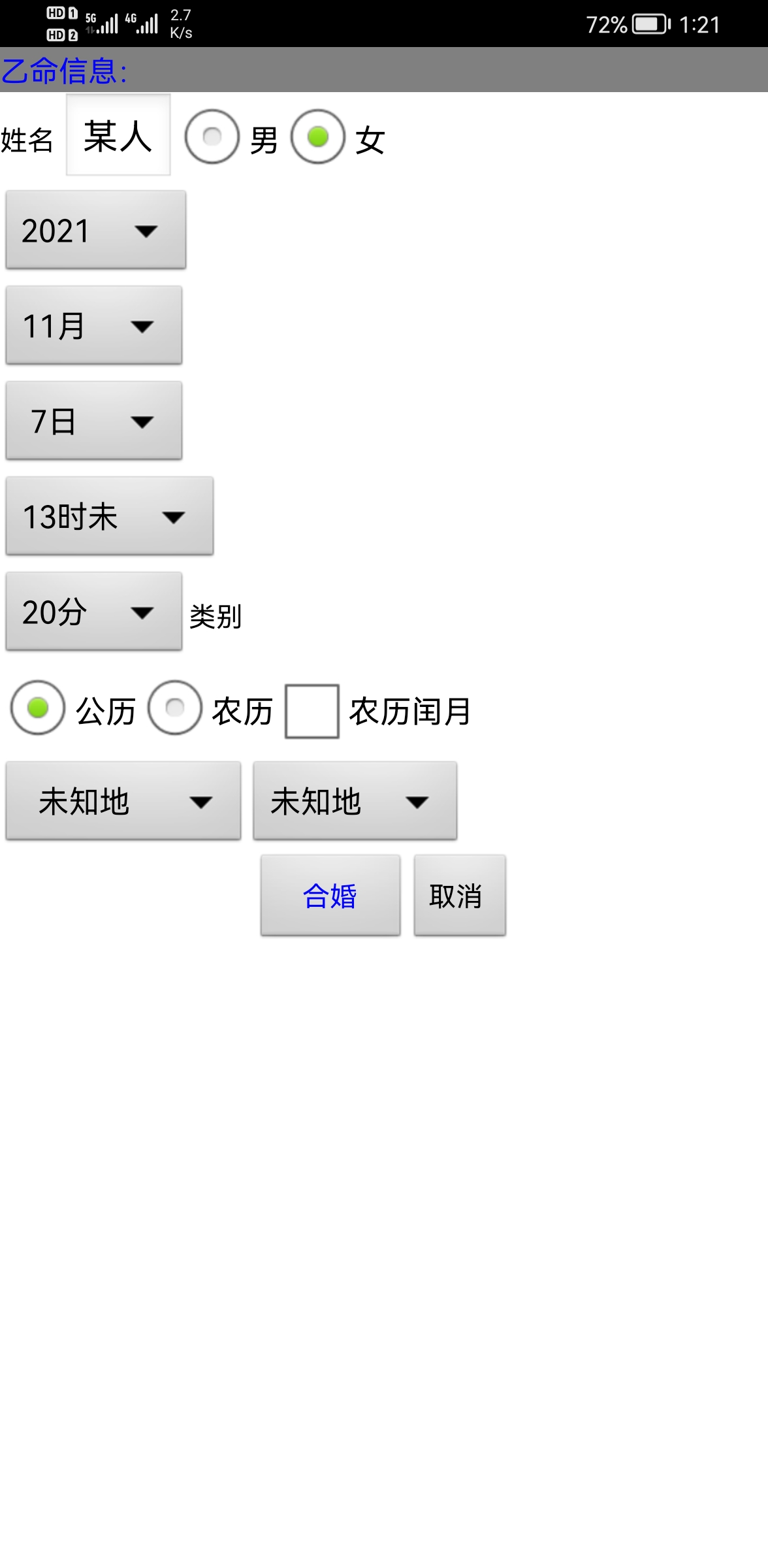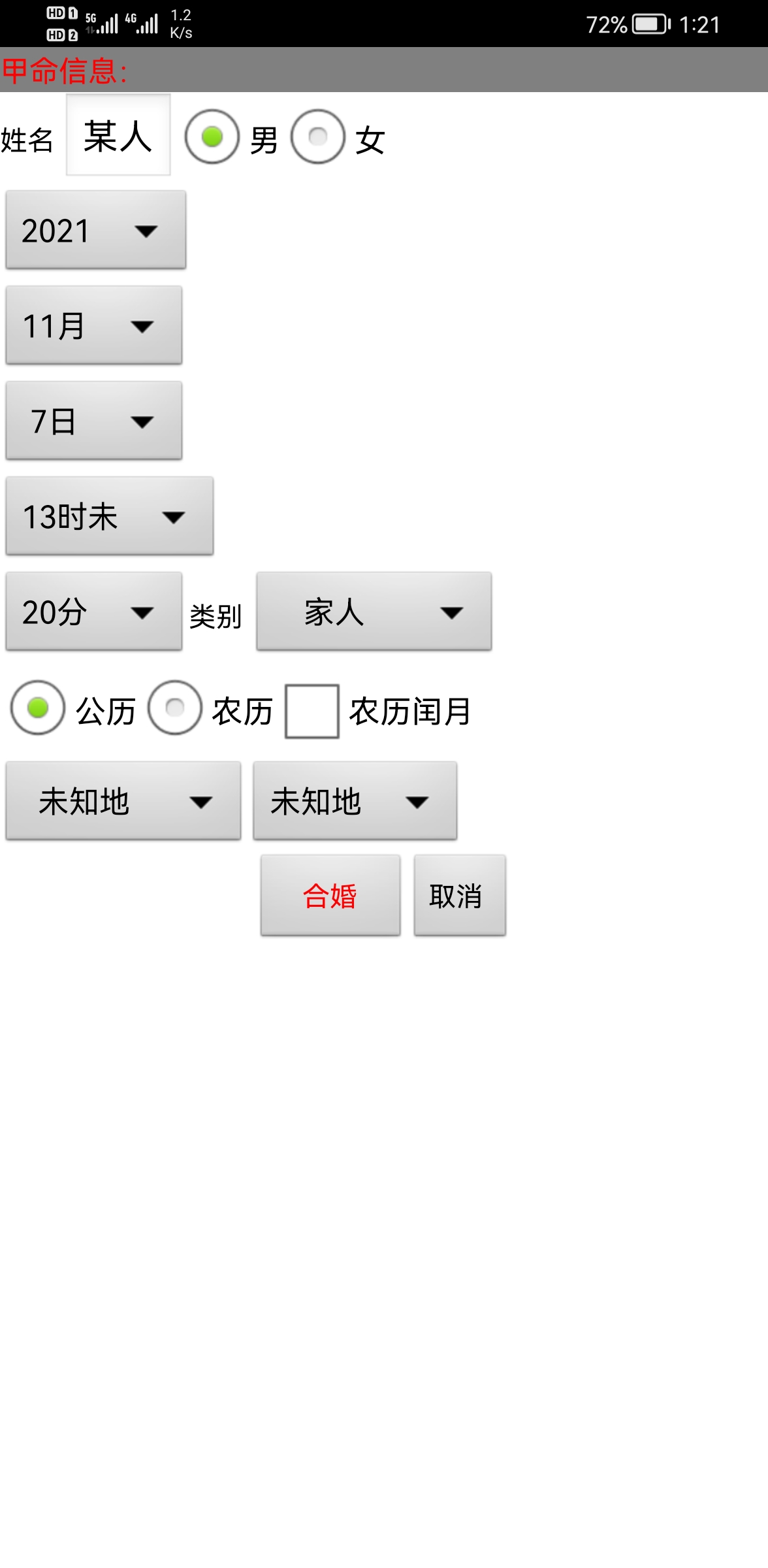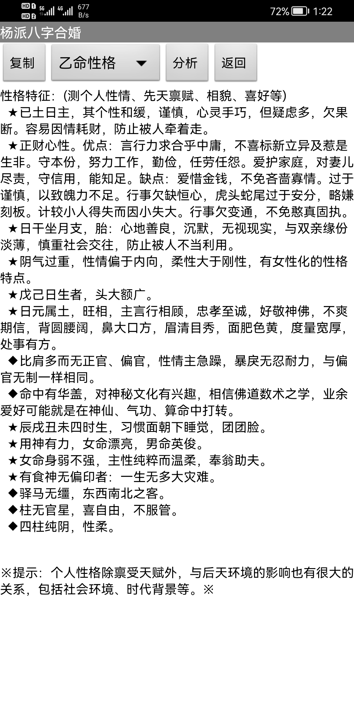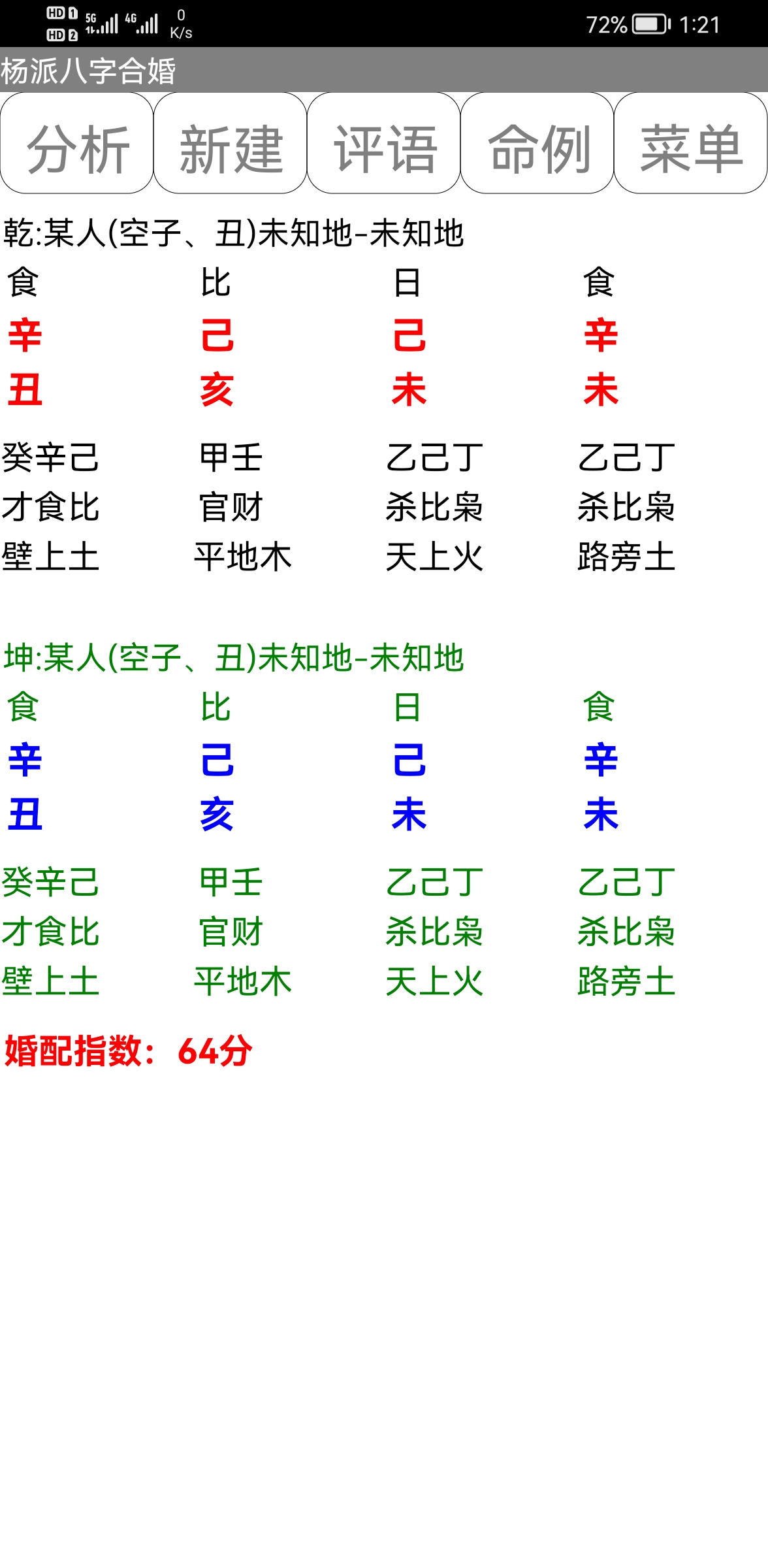 售价:150元 有需要者加微信gn413168 软件说明: 1:运行环境:手机安卓系统\鸿蒙系统均可使用 2:本软件为绿色软件,安装软件时只完成复制,卸载时直接删除,不会往你的系统文件夹拷入文件,不会修改注册表,请放心使用,不带任何插件。 3:本软件为共享软件,未注册有功能限制,但没有时间限制。注册后你可以使用所有功能,并且享受软件日后的免费升级,和使用时作者亲自提供的技术支持。 4:你可以分发、传播这个软件,但作者拥有对软件的所有权。请不要对它进行反汇编、破解,谢谢你的合作。 ================================================================ ※ 杨派八字合婚 2.0正式版 ※ 一:八字合婚: 1:点“新建”或者“开始合婚”按钮,按提示依次输入两个人的生日、性别、姓名等参数。 2:输入完毕后,软件将自动分析八字之间的关系,给出判断结果。 3:如果对八字分析给出的用神、五行力量有异议,可以点“测算”按钮上方的“设置用神”自己设置用神 、五行力量,软件将按输入的数值,重新进行运算。 提示:除了可以给男、女合婚用,也可以看两个人之间的关系,男-男、女-女都可以,据此判断两人是否有 缘。 二:结婚择日: 1:在“合婚配对”版块输入两个人的生日合婚后,可以进入“结婚择日”版块,选择要结婚的年份,软件会给出当年适合的日子、时辰。 三:历史记录管理 1:软件可以保存无限多的命例,并可以方便地查找、编辑、修改历史记录。 2:记录管理功能,可在软件左边的命例列表上查看右键菜单。 3:查看历史记录时,如果进行了修改,可以点击“布卦”按钮上方的“存旧”图标,保存修改后的文本 。 4:软件启动时,只显示最近保存的最多 1000个案例,如果要显示全部或者查找指定类别,可以按鼠标右键 ,执行对应功能。 -------------甲命八字------------- 姓名:某人 出生地:未知地-未知地。 公历:2021-11-7 13:20(北京时间),星期日。 农历:二○二一年十月初三日未时 食 比 日元 食 乾造 辛 己 己 辛 丑 亥 未 未 藏干 癸辛己 甲壬 乙己丁 乙己丁 才食比 官财 杀比枭 杀比枭 起运:0岁0个月1天,11月8日交运(公历) 劫 枭 印 杀 官 才 财 食 戊戌 丁酉 丙申 乙未 甲午 癸巳 壬辰 辛卯 养 长生 沐浴 冠带 临官 帝旺 衰 病 1 11 21 31 41 51 61 71 2021 2031 2041 2051 2061 2071 2081 2091 ※胎元:庚寅(松柏木) 命宫:己亥(平地木) ☆年命:壁上土(下元) ☆星座:天蝎座。 生肖:牛 命局生克制化: 个数(计干): 2旺水 3相木 2死火 5囚土 3休金 个数(不计): 1旺水 0相木 0死火 5囚土 2休金 力量:水75(26.6%) 木24(8.5%) 火10(3.5%) 土98(34.8%) 金75(26.6%) 己生助:108(38.3%) 克泄耗:174(61.7%)。 阴气:204(72.3%) 阳气:78(27.7%)。 ※日主综合得分:-2。 日元偏弱,喜用火,土(印枭、比劫)。忌仇水,金(财星、食伤)。 己土生于亥月,水旺、木相、金休、土囚、火死。 生于寒冷冬季,八字可适当借火调候。 ※此命局未入正格。 ※天干无合。地支有丑未年日相冲,丑未年时相冲。 -------------乙命八字------------- 姓名:某人 出生地:未知地-未知地。 公历:2021-11-7 13:20(北京时间),星期日。 农历:二○二一年十月初三日未时 食 比 日元 食 坤造 辛 己 己 辛 丑 亥 未 未 藏干 癸辛己 甲壬 乙己丁 乙己丁 才食比 官财 杀比枭 杀比枭 起运:9岁10个月23天,9月30日交运(公历) 伤 食 财 才 官 杀 印 枭 庚子 辛丑 壬寅 癸卯 甲辰 乙巳 丙午 丁未 绝 墓 死 病 衰 帝旺 临官 冠带 11 21 31 41 51 61 71 81 2031 2041 2051 2061 2071 2081 2091 2101 ※胎元:庚寅(松柏木) 命宫:己亥(平地木) ☆年命:壁上土(下元) ☆星座:天蝎座。 生肖:牛 命局生克制化: 个数(计干): 2旺水 3相木 2死火 5囚土 3休金 个数(不计): 1旺水 0相木 0死火 5囚土 2休金 力量:水75(26.6%) 木24(8.5%) 火10(3.5%) 土98(34.8%) 金75(26.6%) 己生助:108(38.3%) 克泄耗:174(61.7%)。 阴气:204(72.3%) 阳气:78(27.7%)。 ※日主综合得分:-2。 日元偏弱,喜用火,土(印枭、比劫)。忌仇水,金(财星、食伤)。 己土生于亥月,水旺、木相、金休、土囚、火死。 生于寒冷冬季,八字可适当借火调候。 ※此命局未入正格。 ※天干无合。地支有丑未年日相冲,丑未年时相冲。 --------------------------------------------------------- 婚姻配对分析: 婚配指数:64分 ☆乙命对甲命有41%的补益作用力,甲命对乙命有41%的补益作用力。 ☆双方喜用神互相生助,有共同点,容易相处。 ☆双方八字交会后,五行平衡性为75%。 ☆双方八字交会后,阴阳平衡性为55%。 ☆甲乙命日元搭配不和谐,相处不容易。 ☆甲乙命生年无害,可以交往! ☆九星合婚得:绝命,男女更有忧亡。 ☆甲命天蝎座,乙命天蝎座,较为和谐的一对。 ☆男命生日密码:5,女命生日密码:5,两人不适合在一起,没有姻缘。 ★甲命对照乙命:天干无合。地支有亥亥甲月乙月自刑。 ★乙命对照甲命:天干无合。地支有亥亥乙月甲月自刑。 ※提示:指数有在60分以上,双方可以交往,喜配良缘的机会大。80分以上者,如能婚配真是天生的一对。※ ---------------------甲命性格------------------------- 性格特征:(测个人性情、先天禀赋、相貌、喜好等) ★已土日主,其个性和缓,谨慎,心灵手巧,但疑虑多,欠果断。容易因情耗财,防止被人牵着走。 ★正财心性。优点:言行力求合乎中庸,不喜标新立异及惹是生非。守本份,努力工作,勤俭,任劳任怨。爱护家庭,对妻儿尽责,守信用,能知足。缺点:爱惜金钱,不免吝啬寡情。过于谨慎,以致魄力不足。行事欠缺恒心,虎头蛇尾过