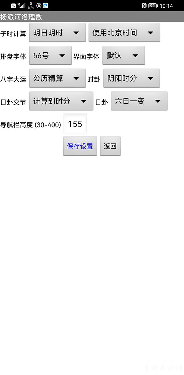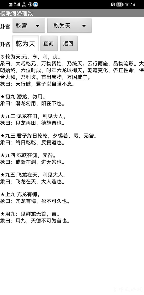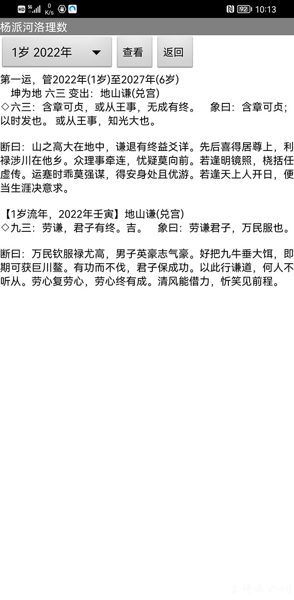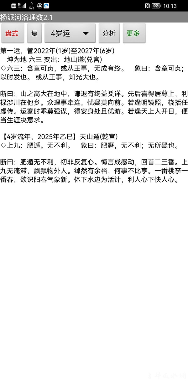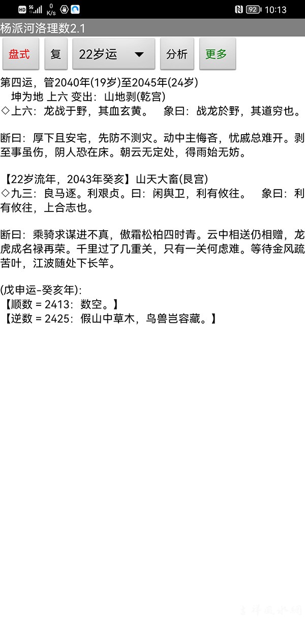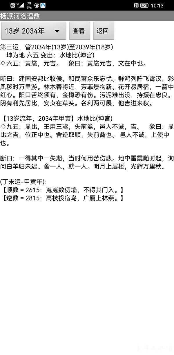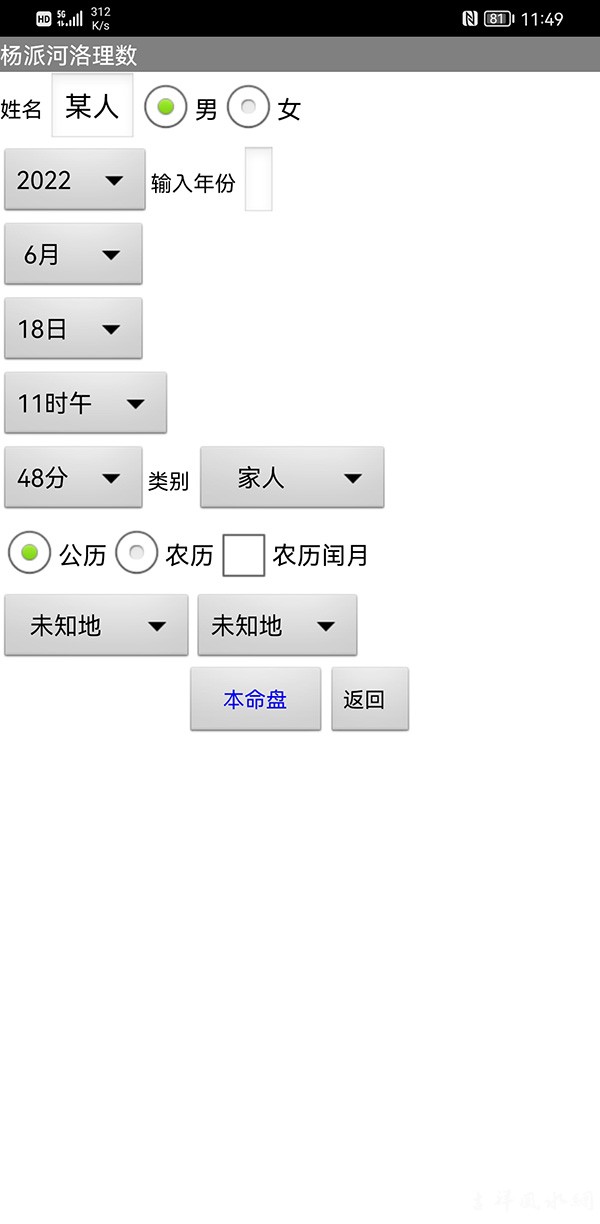 售价:150元 有需要者加微信gn413168 软件说明: 1:运行环境:安卓系统\鸿蒙系统 2:本软件为绿色软件,安装软件时只完成复制,卸载时直接删除,不会往你的系统文件夹拷入文件,不会 修改注册表,请放心使用,不带任何插件。 3:本软件为共享软件,未注册有功能限制,但没有时间限制。注册后你可以使用所有功能,并且享受软件 日后的免费升级,和使用时作者亲自提供的技术支持。 4:你可以分发、传播这个软件,但作者拥有对软件的所有权。请不要对它进行反汇编、破解,谢谢你的合 作。 ================================================================ ※ 杨派河洛理数 2.1正式版 ※(2022/06/18更新) 一:排盘: 1:在右边面板输入命主出生日期、出生地(如果软件设置使用真太阳,地点必须选择,反之不选也可)姓 名、性别。(主命生年支持公元前4713 到 9999年) 2:出生时间、公农历(如出生时间是农历,要勾选是否农历闰月)(时间支持公元前4713 到 9999年) 3:选择预测地点(如果在软件设置里面选择了“真太阳时”或者“地方时”,不同地点对四柱有影响。选 择北京时间,地点对四柱没有影响)。 4:点“本命盘”按钮,就可以看到河洛盘。 5:排出本命盘后,就可以排 流年盘了。输入流年时间(公历),点“流月流日”按钮,就可以在左下角 看 到流年盘信息。 ========软件设置会影响排盘,设置选项说明============= 一:日卦交节 1:计算到日,只算流日时间到节气间隔的日数,只算天数,没有计算时、分。 2:计算到时分,精确计算流日时间到节气间隔的日数,计算到时、分。 二:日卦计算 1:六日一变,交节开始,六天变一卦,首日初爻起。 2:五日一变,交节开始,五天一变卦,作为首日卦,接下来的日子,依次从下往上变。 三:时卦计算 1:按跹羰鼻?郑?词背降牟煌??映笠??剿任?羰保?渌??跏保?炙衬娌钾浴� 2:同流年流月法,日卦变时卦,方法同年卦变月卦,12个月看成12个时处理。 四:子时计算,有4种方式,针对23点 - 0点的子时特别处理,0点 到 1点的子时自然算入当日。 1:明日明时,日柱按第二日算,时柱按第二日子时算(时干随日遁)。(建议用此项) 2:明日今时,日柱按第二日算,时柱按今日子时算。 3:今日明时,日柱按今日算,时柱按明日子时算。 4:今日今时,日柱按今日算,时柱按今日子时算(时干随日遁)。 ======================================================================= ======================================================================= 二:历史记录管理 1:软件可以保存无限多的命例,并可以方便地查找、编辑、修改历史记录。 2:记录管理功能,可在软件左边的命例列表上查看右键菜单。 3:查看历史记录时,如果进行了修改,可以点击“布卦”按钮上方的“存旧”图标,保存修改后的文本 。 4:菜单“文件->导出历史记录”可以把当前所有历史记录另存到指定的目录,适用于软件升级时保存旧版 本的记录(导出的记录,可以在安装后的新版软件重新导入) 5:菜单“文件->导入历史记录”可以把导出的历史记录重新加入现在的软件,使用此功能,将先清除现有 的记录。(此功能可以把旧版本的软件的历史记录导入) 6:菜单“文件->整理记录文件”将优化现有记录文件,读取提高速度。 7:软件启动时,只显示最近保存的最多 1000个案例,如果要显示全部或者查找指定类别,可以按鼠标右 键 ,执行对应功能。 ======================================================== 参考书目:《河洛理数》、《河洛精蕴》、《河洛真数》、《实用河洛理数全集》等。 |