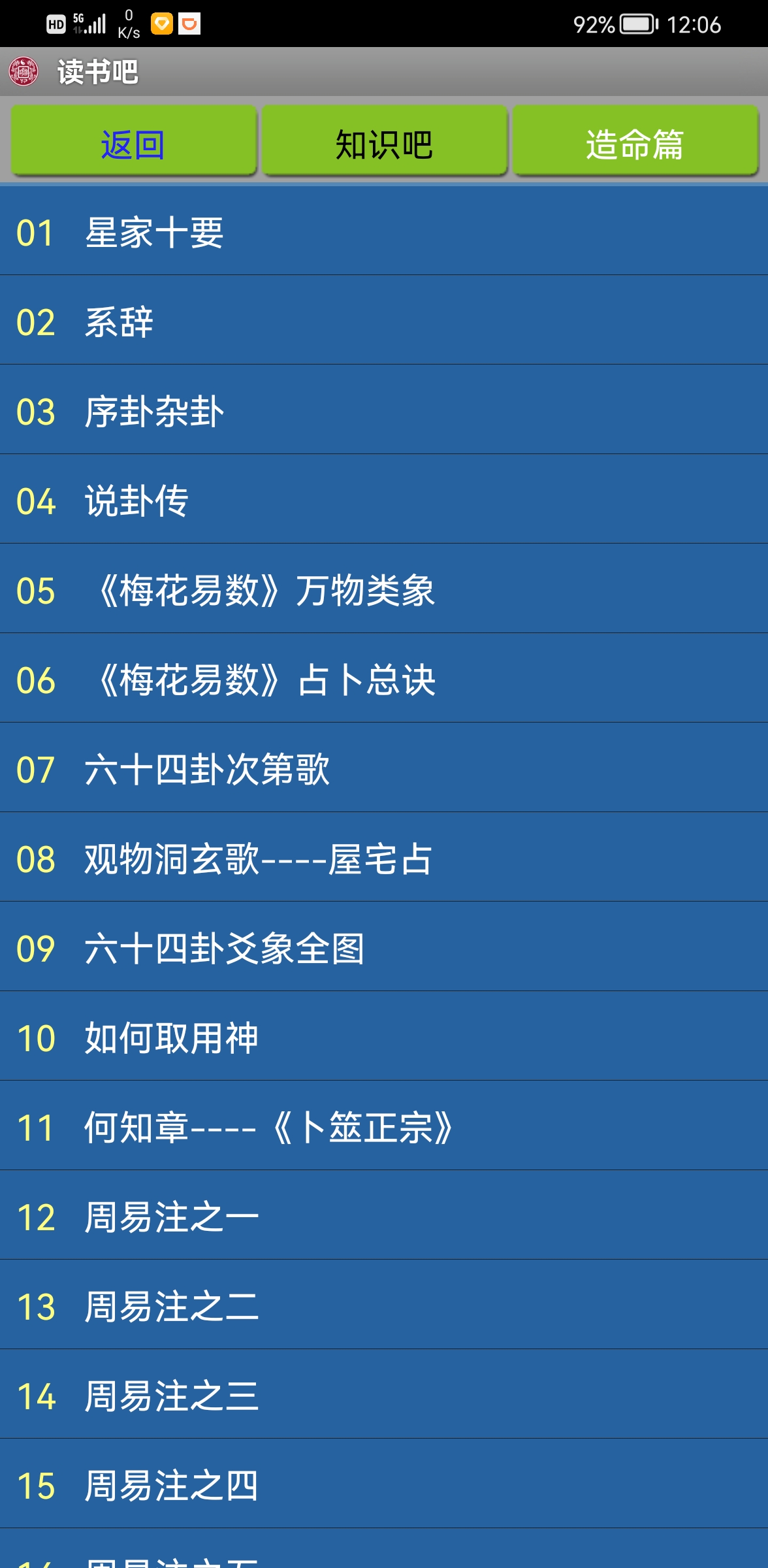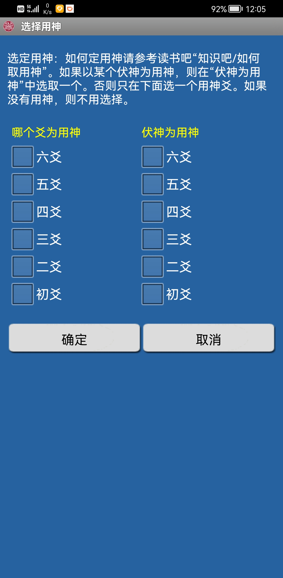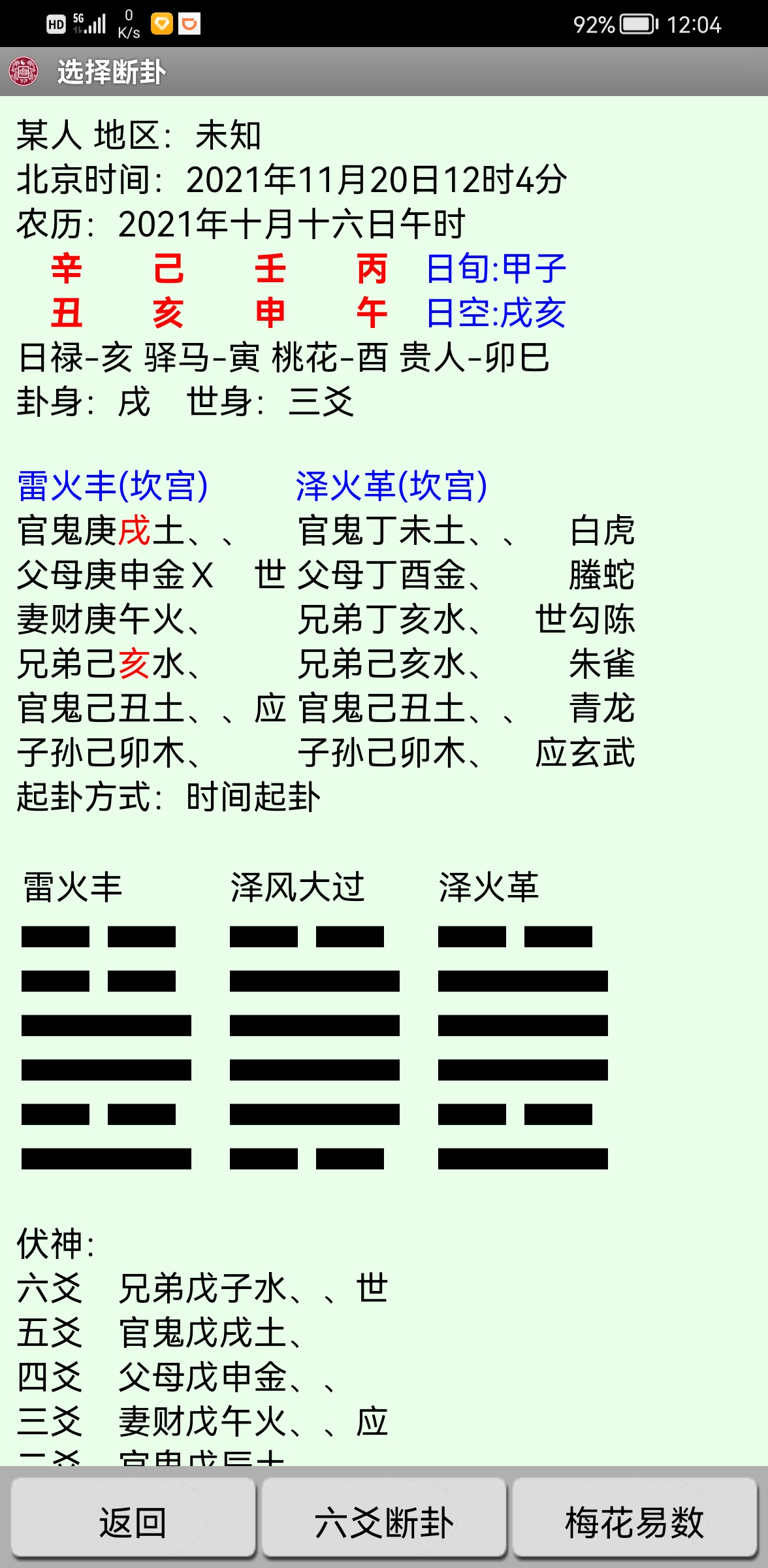 适用于安卓系统、鸿蒙系统使用 售价:268元 有需要者加微信gn413168 手机六爻断卦 V2.13 本软件是手机六爻断卦程序android版,android系统V4.0及以上版本手机和平板电脑、华为鸿蒙系统,都可以安装使用。 软件起卦方法有:时间起卦、数字起卦、手选起卦、铜钱起卦、分秒起卦、模拟起卦、随机起卦、起终身卦。断卦方法有“六爻断卦”、“梅花易数”。 无论按哪种方式起卦,先选定起卦时间,再选择起卦方式。选择好各个数据后,点击“起卦”按钮,会排出内容。在这个页面里,有“六爻断卦”和“梅花易数”两种断卦方式。 如果古式显示卦六爻卦线条对不整齐,则点击选项菜单里的“古式显示卦爻线条对齐调整”。 本程序浏览器显示内容字体大小可自行选择,背景颜色有三种选择,您可选择设定喜欢的字体和背景色。 您也可以在显示浏览器内容的页面,点击“保存(html)”按钮,保存内容为浏览器格式。点击“编辑分享内容”按钮,可将内容转成纯文本格式。再点击“分享”按钮,选择通过微信、微博等方式分享内容给好友。 程序首页“保存卦例”功能:程序会自动备份保存的卦例文件到“本地存储”nfdata/LiuyaoDuangua文件夹里。如果换手机,在不打开六爻断卦软件的前提下,先在“本地存储”里创建nfdata文件夹,再将整个LiuyaoDuangua文件夹复制到此路径里,这样就恢复了所有保存的卦例。 起卦年份介于1882-2060。 主卦各爻地支用不同颜色标出:旬空(红色)、月破(蓝色)、日冲(蓝色)、日合(绿色)。 点击“保存卦例”按钮,可保存当前排出的卦,最多可保存2000条卦例。 点击“显示卦例”按钮,可列出保存过的卦例。点击选择要排出卦例,再按此页面里“起卦”按钮,可排出此卦内容。按“删除卦例”可删除此条卦例。 示例 某人 地区:未知 北京时间:2021年11月20日12时4分 农历:2021年十月十六日午时 辛 己 壬 丙 日旬:甲子 丑 亥 申 午 日空:戌亥 日禄-亥 驿马-寅 桃花-酉 贵人-卯巳 卦身:戌 世身:三爻 雷火丰(坎宫) 泽火革(坎宫) 官鬼庚戌土、、 官鬼丁未土、、 白虎 父母庚申金X 世 父母丁酉金、 螣蛇 妻财庚午火、 兄弟丁亥水、 世勾陈 兄弟己亥水、 兄弟己亥水、 朱雀 官鬼己丑土、、应 官鬼己丑土、、 青龙 子孙己卯木、 子孙己卯木、 应玄武 起卦方式:时间起卦 雷火丰 ▅▅ ▅▅ ▅▅ ▅▅ ▅▅▅▅▅ ▅▅▅▅▅ ▅▅ ▅▅ ▅▅▅▅▅ 泽风大过 ▅▅ ▅▅ ▅▅▅▅▅ ▅▅▅▅▅ ▅▅▅▅▅ ▅▅▅▅▅ ▅▅ ▅▅ 泽火革 ▅▅ ▅▅ ▅▅▅▅▅ ▅▅▅▅▅ ▅▅▅▅▅ ▅▅ ▅▅ ▅▅▅▅▅ 伏神: 六爻 兄弟戊子水、、世 五爻 官鬼戊戌土、 四爻 父母戊申金、、 三爻 妻财戊午火、、应 二爻 官鬼戊辰土、 初爻 子孙戊寅木、、 焦氏易林:丰之革:魂孤无室,衔损不食。盗张氏馈,见敌失肉。 主卦数:4 + 3 = 7 主卦神煞: 六爻:空亡 五爻: 四爻: 三爻:空亡 二爻: 初爻:天乙 变卦神煞: 六爻: 五爻:咸池 四爻:空亡 三爻:空亡 二爻: 初爻:天乙 六爻断卦分析: 世爻化进神,吉。 螣蛇发动,主疾病、惊恐、怪异之事。 世爻临日辰生旺之地,吉。 卦变比和,大象吉。 世爻化进神,吉。 测来意: 父母爻动克子孙爻,子女有病。 官鬼爻落空亡又休囚,家里有是非、官司。 定应期: 世爻有气发动临日辰,以当日为应期。 世爻受制,可以忌神到位之年月日为应期,也可以克制忌神之年月日为应期。 问升学: 世应相生,考试成绩理想,可一举成名。 事业功名: 父母爻临世,若为官,必在富裕发达之地。 问婚姻: 世应相生,测结婚者婚姻易成。 应生世,女方贪财,容易答应婚事。 日辰临父母爻,婚期已定。 财爻休囚,女方是贫家之人,或妻子不得力。 财官休囚,婚姻不顺,本人身体瘦。 财克世,婚姻遭妒忌。 问子女: 子孙爻临月令生旺之地,吉。 子孙爻临日辰休囚之地,凶。 子孙爻受动爻克,凶。 子孙爻旺相化子孙,主双胞胎。 妻财爻临月日休囚之地,断临产主母亲不利。 子孙爻旺相,不空,无冲,主子女贤能有出息。 父母爻持世,不利子女。 问财运: 财爻不动,逢冲日可得。 父母爻动克子孙爻,不利求财,防亏本。 世应相生,利生意合作,同心协力。应生世,他益于我,生意容易成。 兄临朱雀,防口舌是非。 财爻衰变旺,物价必涨。 财爻衰,买卖宜缓买。 财爻安静,积货有利,出货不利。 父母爻持世,求财辛苦。 问行人: 卦中动爻、变爻、日月都无财爻出现,行人无路费返回。 用神无月日动爻冲者,行人没有回来打算。 父母爻动,行人有书信或电话回来。 问出行: 世爻动而化进神,吉。 世爻属金,喜坤艮方,忌离方。 妻财爻休囚,出门路费少。 世爻动而行期已定。 父母持世,路上不顺利,或为行李所累,或因风雨而阻。 间爻安静,往来安泰。 问官司争讼: 太岁临鬼,官司升级。 世爻动,我定计谋。 应变鬼,官司不小,麻烦大。 应生世,于我有利,吉。 父母爻衰,讼事无头绪,或讼状有破绽。 父母爻持世,我告他。 内外有官,事必两处或两处不管,主事经反复后结案。 兄弟在间爻,牵连证人多。 间爻克世生应,防证人同来害我。 兄化兄,打官司消耗很大。 官爻衰,罪轻。 太岁生世,得意外之助,或减刑。 问失物: 世应相生,东西没有丢失或可找到。 蛇临世爻,自己忘记。 卦有二鬼,为二人共同做案。 鬼与世爻相生,东西可能被亲戚朋友拿去。 小偷从东北方来,又去了东北方。 官鬼爻空,小偷难寻。 外卦财爻休囚,失物已去远