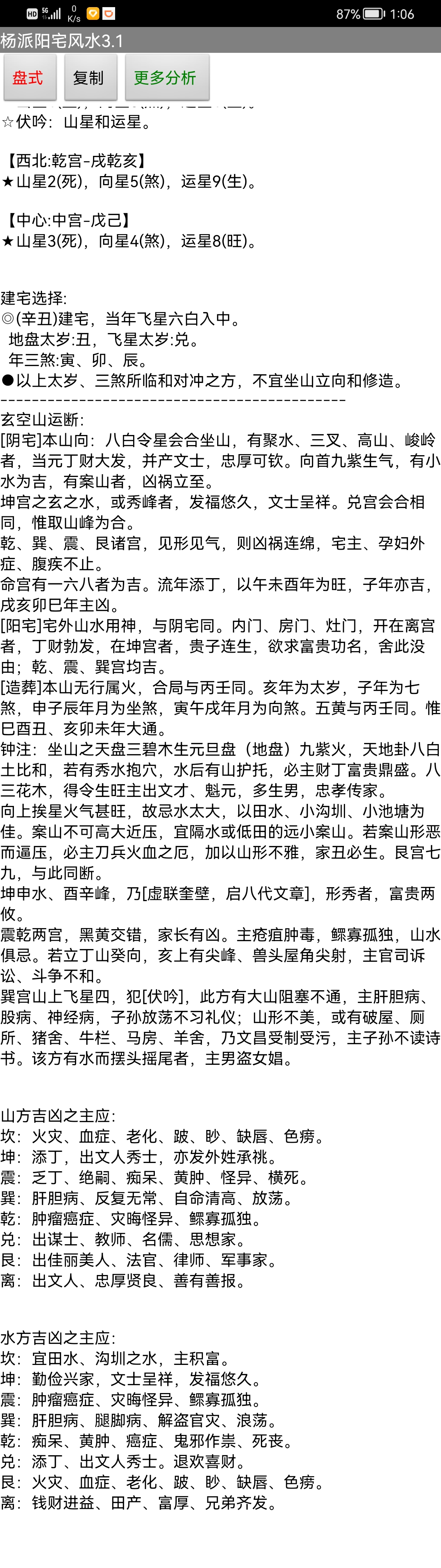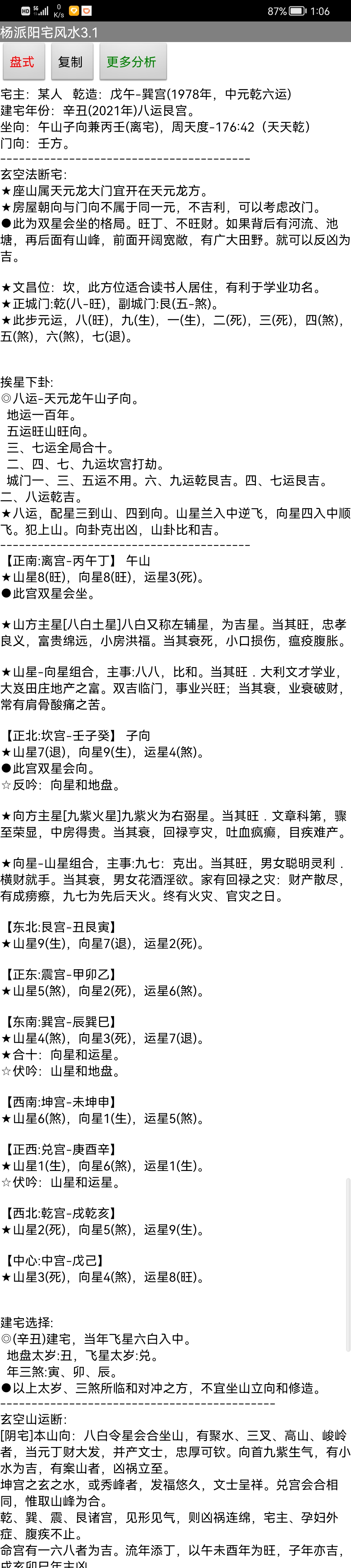 售价:150元 有需要者加微信gn413168 一:排盘 以下操作,在软件界面下方的输入面板上。 1:点“新建”,开始一个新的阳宅案例。 2:输入建宅年份,输入完毕,直接按回车键,下方会直接给出对应元运。也可以年份、元运分别输入,但 是不能矛盾。 3:选择房屋坐向,这个可以用罗盘测得。输入周天度,也可以在罗盘上读到。 4:玄空盘,可以选择下卦、替卦排法,一般是兼向用替卦,需要综合考虑,自己选定。 5:选择门向。 6:输入宅主生年,也可以点击上面的“人物按钮”,输入完整的生日(这样可以求得八字、具体的公农历 )。选择宅主性别。 7:输入姓名,保存按钮的时候识别用。 最后点“布宅局”按钮,软件通过运算,就可以给出图文并茂的参考信息了。 提示:玄空盘、八宅盘里的坐山线、24山圈都可以拖动旋转、图形大小可以拉伸。 ======================================================================== 二:导入户型图 1:点击“布宅局”右边的房子图标,选择户型图导入查看。 2:玄空盘、八宅盘里的坐山线、24山圈都可以拖动旋转、图形大小可以拉伸。宅盘上按鼠标,可以叠加到 户型图上面。 3:户型图上面按鼠标右键,有各种功能。 4:点击软件上面的菜单“辅助工具”可以编辑户型图上面的绘画工具,比如“直线、圆、方形、文字、笔 擦等等”,还可以设置画笔属性、文字属性等。 ============================================================================== 三:历史记录管理 1:软件可以保存无限多的命例,并可以方便地查找、编辑、修改历史记录。 2:记录管理功能,可在软件左边的命例列表上查看右键菜单。 3:查看历史记录时,如果进行了修改,可以点击“布卦”按钮上方的“存旧”图标,保存修改后的文本 4:软件启动时,只显示最近保存的最多 1000个案例,如果要显示全部或者查找指定类别,可以按鼠标右 键,执行对应功能。 示例 宅主:某人 乾造:戊午-巽宫(1978年,中元乾六运) 建宅年份:辛丑(2021年)八运艮宫。 坐向:午山子向(离宅),周天度-177:13(天天乾) 门向:壬方。 ---------------------------------------- 玄空法断宅: ★座山属天元龙大门宜开在天元龙方。 ★房屋朝向与门向不属于同一元,不吉利,可以考虑改门。 ●此为双星会坐的格局。旺丁、不旺财。如果背后有河流、池塘,再后面有山峰,前面开阔宽敞,有广大田野。就可以反凶为吉。 ★文昌位:坎,此方位适合读书人居住,有利于学业功名。 ★正城门:乾(八-旺),副城门:艮(五-煞)。 ★此步元运,八(旺),九(生),一(生),二(死),三(死),四(煞),五(煞),六(煞),七(退)。 挨星下卦: ◎八运-天元龙午山子向。 地运一百年。 五运旺山旺向。 三、七运全局合十。 二、四、七、九运坎宫打劫。 城门一、三、五运不用。六、九运乾艮吉。四、七运艮吉。二、八运乾吉。 ★八运,配星三到山、四到向。山星兰入中逆飞,向星四入中顺飞。犯上山。向卦克出凶,山卦比和吉。 ---------------------------------------- 【正南:离宫-丙午丁】 午山 ★山星8(旺),向星8(旺),运星3(死)。 ●此宫双星会坐。 ★山方主星[八白土星]八白又称左辅星,为吉星。当其旺,忠孝良义,富贵绵远,小房洪福。当其衰死,小口损伤,瘟疫腹胀。 ★山星-向星组合,主事:八八,比和。当其旺.大利文才学业,大岌田庄地产之富。双吉临门,事业兴旺;当其衰,业衰破财,常有肩骨酸痛之苦。 【正北:坎宫-壬子癸】 子向 ★山星7(退),向星9(生),运星4(煞)。 ●此宫双星会向。 ☆反吟:向星和地盘。 ★向方主星[九紫火星]九紫火为右弼星。当其旺.文章科第,骤至荣显,中房得贵。当其衰,回禄亨灾,吐血疯癫,目疾难产。 ★向星-山星组合,主事:九七:克出。当其旺,男女聪明灵利.横财就手。当其衰,男女花酒淫欲。家有回禄之灾:财产散尽,有成痨瘵,九七为先后天火。终有火灾、官灾之日。 【东北:艮宫-丑艮寅】 ★山星9(生),向星7(退),运星2(死)。 【正东:震宫-甲卯乙】 ★山星5(煞),向星2(死),运星6(煞)。 【东南:巽宫-辰巽巳】 ★山星4(煞),向星3(死),运星7(退)。 ★合十:向星和运星。 ☆伏吟:山星和地盘。 【西南:坤宫-未坤申】 ★山星6(煞),向星1(生),运星5(煞)。 【正西:兑宫-庚酉辛】 ★山星1(生),向星6(煞),运星1(生)。 ☆伏吟:山星和运星。 【西北:乾宫-戌乾亥】 ★山星2(死),向星5(煞),运星9(生)。 【中心:中宫-戊己】 ★山星3(死),向星4(煞),运星8(旺)。 建宅选择: ◎(辛丑)建宅,当年飞星六白入中。 地盘太岁:丑,飞星太岁:兑。 年三煞:寅、卯、辰。 ●以上太岁、三煞所临和对冲之方,不宜坐山立向和修造。 -------------------------------------------- 玄空山运断: [阴宅]本山向:八白令星会合坐山,有聚水、三叉、高山、峻岭者,当元丁财大发,并产文士,忠厚可钦。向首九紫生气,有小水为吉,有案山者,凶祸立至。 坤宫之玄之水,蛐惴逭撸?⒏S凭茫?氖砍氏椤6夜?岷舷嗤??┤∩椒逦?稀� 乾、巽、震、艮诸宫,见形见气,则凶祸连绵,宅主、孕妇外症、腹疾不止。 命宫有一六八者为吉。流年添丁,以午未酉年为旺,子年亦吉,戌亥卯巳年主凶。 [阳宅]宅外山水用神,与阴宅同。内门、房门、灶门,开在离宫者,丁财勃发,在坤宫者,贵子连生,欲求富贵功名,舍此没由;乾、震、巽宫均吉。 [造葬]本山无行属火,合局与丙壬同。亥年为太岁,子年为七煞,申子辰年月为坐煞,寅午戌年月为向煞。五黄与丙壬同。惟巳酉丑、亥卯未年大通。 钟注:坐山之天盘三碧木生元旦