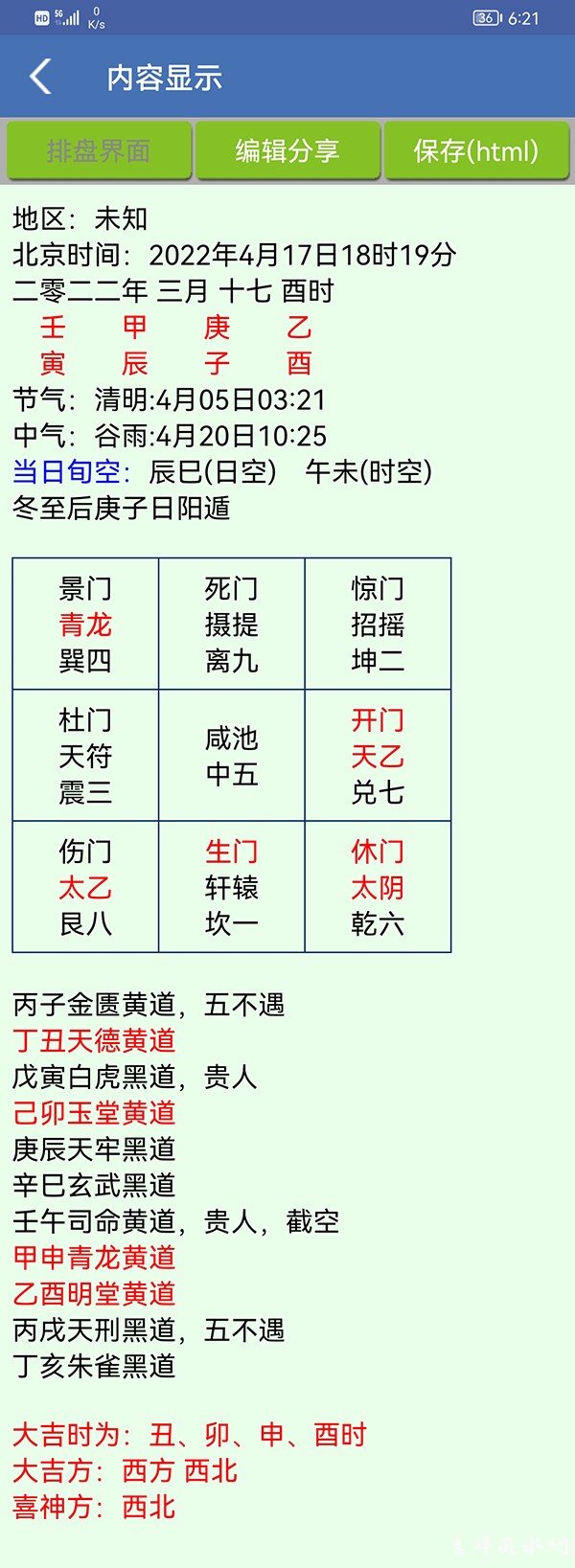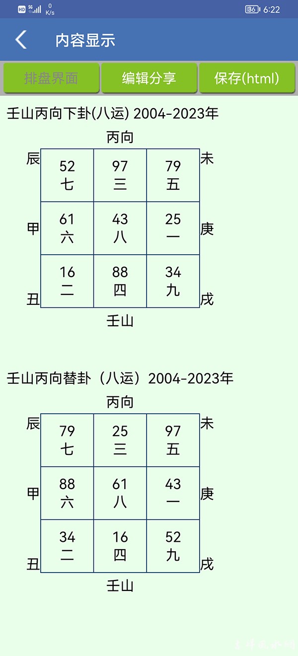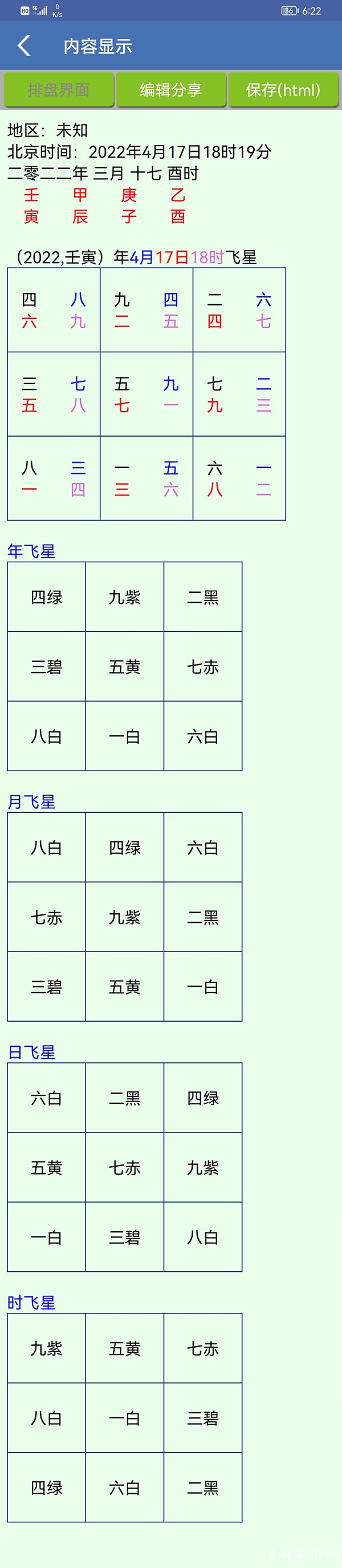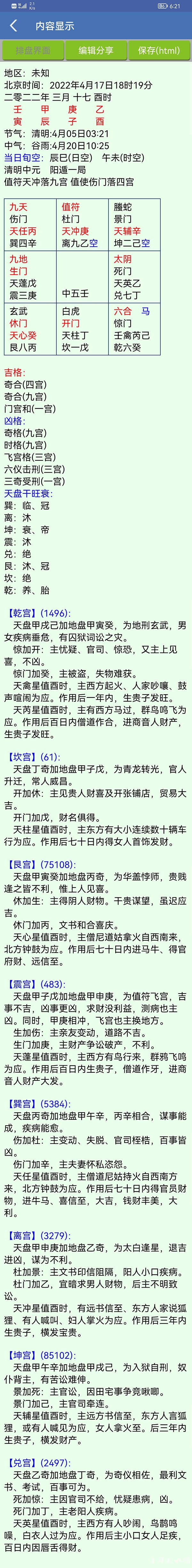 适用于安卓系统、鸿蒙系统使用 售价:368元 有需要者加微信gn413168 本程序包含八字排盘、六爻起卦、玄空风水、六壬金口诀、奇门遁甲等几部分内容。 1、八字排盘内容有八字、大运、起运岁数、四柱神煞、大运神煞、命宫、胎元、岁运并临。称骨算命、重大关口、串宫压运、终身卦、80年小运、大运流年干支、流年神煞等内容。 2、六爻起卦有八种起卦方法,分别是“数字起卦”、“时间起卦”、“手选起卦”、“铜钱起卦”、“分秒起卦”、“模拟起卦”、“随机起卦”、“起终身卦”。 3、玄空风水内容有:年月日时飞星盘、二十四山图、八宅派大游年等。 4、六壬金口诀起课内容有:人元、贵神、将神、地分、空亡、四大空亡、课内神煞、课内旺衰等。 5、奇门遁甲内容有:时家奇门、日家奇门排局。 每次点击“排八字”按钮后,程序会自动保存八字内容到zhpp_PaiBazi.html文件,此文件位于您手机存储卡nfdata文件夹里。您可以重命名此文件。这是浏览器格式文件,您可将此文件拷贝到电脑里,用IE等浏览器打开,然后可将内容拷贝到WORD等编辑器里编辑。 六爻起卦的文件名是zhpp_Liuyao.html,金口诀的文件名是zhpp_Jinkoujue.html,奇门遁甲的文件名是zhpp_Qimen.html。 八字排盘、六爻起卦、六壬金口诀、奇门遁甲几种排盘起局可以保存命例、卦例、课例等。“奇门遁甲”保存时间奇门示例。 |