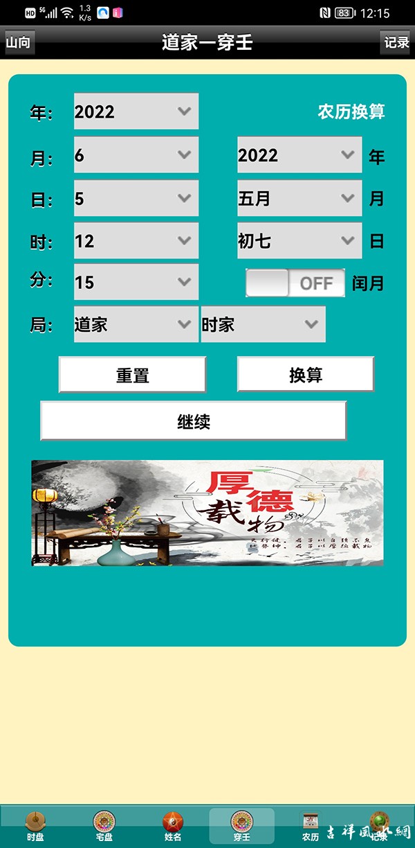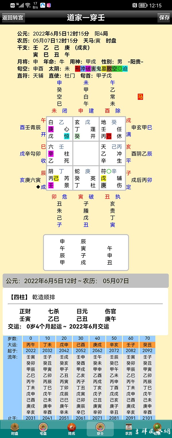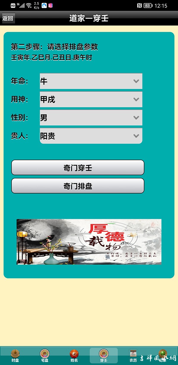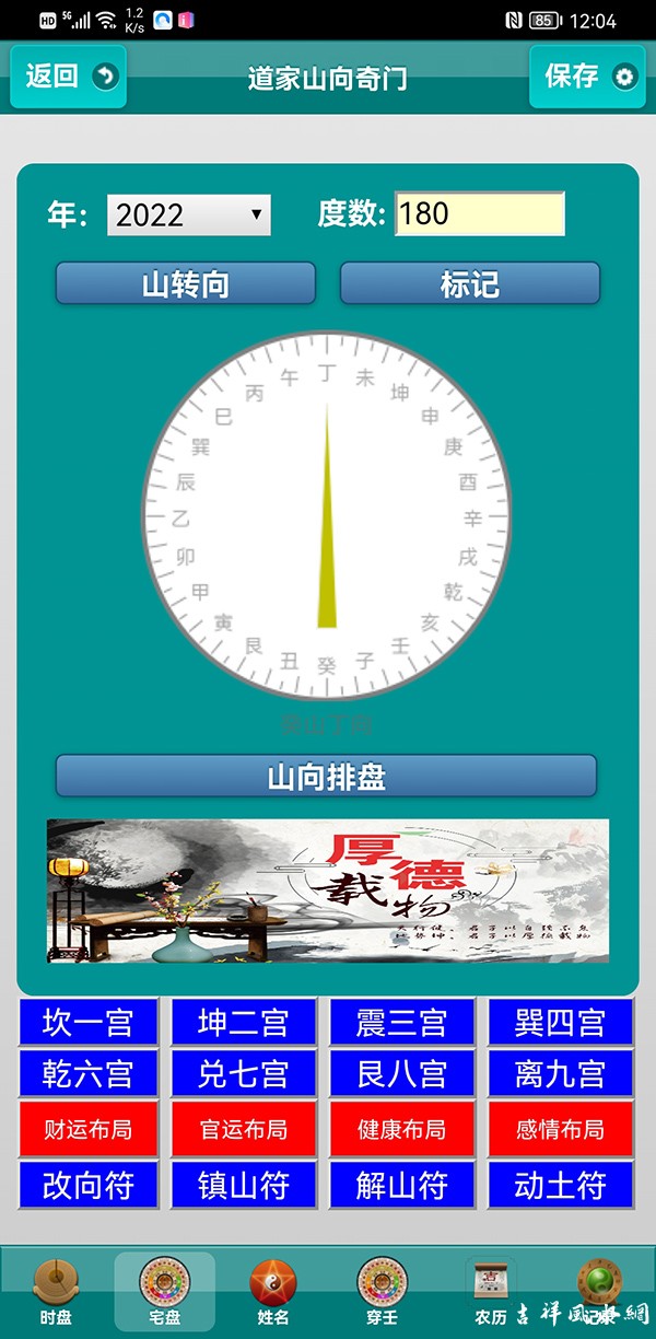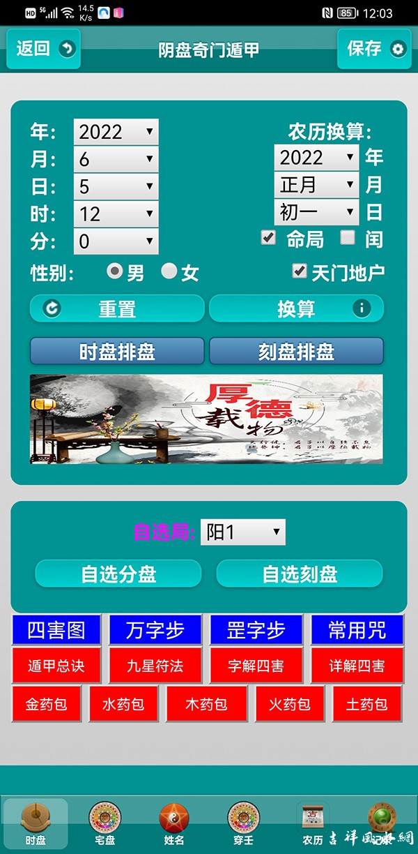 软件,适用于奇门遁甲爱好者使用,此软件功能强大包含时盘排盘、刻家排盘、自选分盘、自选刻盘、命局、天地门户、四害图、万步字、罡字步、常用符咒、九星符法、字解四害、详解四害、金药包、木药包、水药包、火药包、土药包、道家山向奇门、财运布局、官运布局、健康布局、感情布局、改向符、镇山符、解山符、动土符、道家姓名奇门、道家阴盘穿壬、万年历等强大功能。