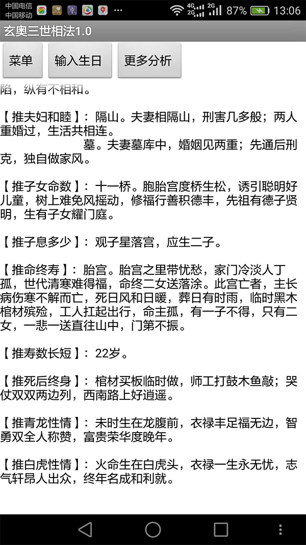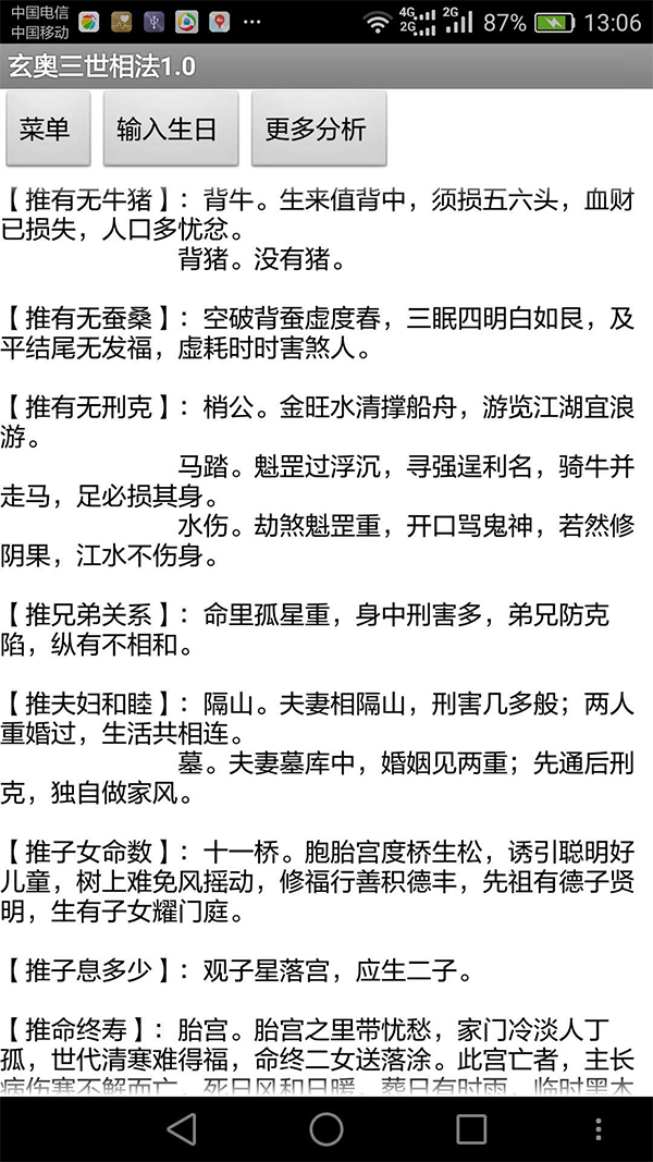 三世是指前世、今世、来世,三世相法是一本古书,相传为袁天罡所著。此书是推人未来的命运、富贵、贫贱与过去之休咎,以演禽与星宿推命,占一生的田园宅舍、婚姻、子女、衣禄、寿终等情况。本软件只需使 ... ... ...