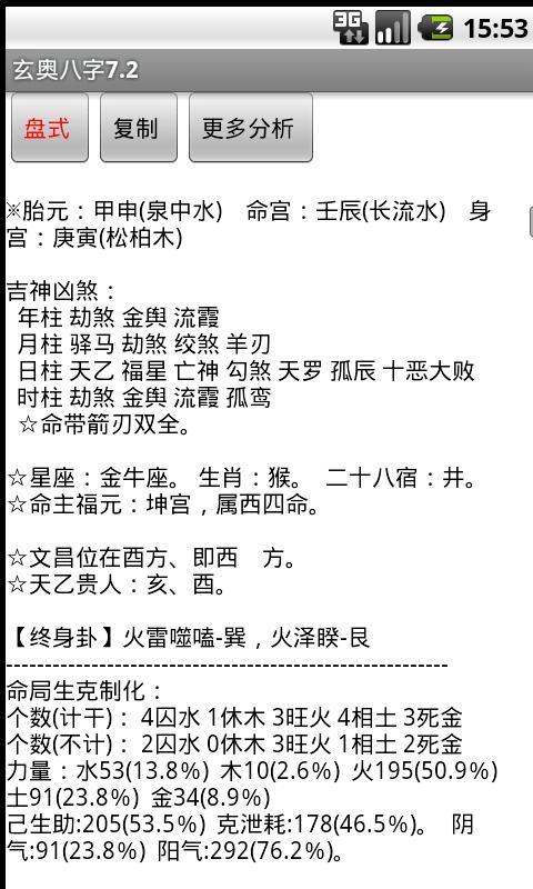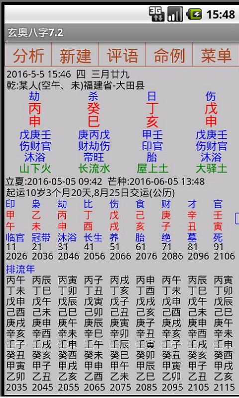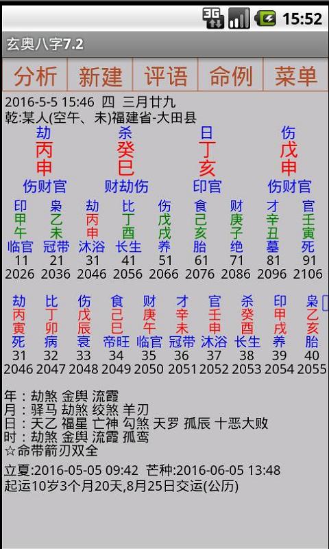 售价:186元 有需要者加微信gn14319 ※八字安卓版 最新版本 7.2 运行环境:Android 系统 开发工具:Eclipse 软件介绍: 专业的八字算命软件,可根据人的出生时间推算命运,原理来自我国古老的易经文化。所有的命理参数都可求得。特有的“运势曲线图”让你把握每一年的运程,详尽的分类预测,解释人生的方方面面。 1:推算范围在-4713年到公元9999年,节气时间采用万年历数据,确保求得正确的八字 2:软件自身具有一定的智能分析功能,对日主的旺衰、命局的五行生克制化都能给出恰当的评价,考虑了专旺、各种从格、化气、半壁、两神成象等特殊变格。 3:对人生的每一年流年运气都给出详细的评价,还有曲线图示,即使不懂八字的人也能看出自己当年的运气。 4:流日运势,显示一个月内每日的运气、体力、智力、情绪的百分数,直观的了解每日自己的状态。 5:详尽的分类预测,可以推测个人性格特征、职业财运、祖业遗产、体质健康、学业、名气、官运、婚姻、家庭子女、兄弟姐妹等等。 6:内有一些通俗易懂的民间预测方法,如:年月日时断命、小儿关煞等。 7:具有从八字反推出生时间的功能。 8:良好的设置功能,可以设定八字重量是以农历还是干支来定月份;设定是否使用变格的喜用神取法;等其他一些选项。 9:带有两个八字量化分析工具,李氏四柱量化、其他四柱量化。 10:完善的命例管理功能,可以无限制保存命例,快速查找命例。 安装使用问题: 1:把“BaZi”这个文件拷贝到手机储存卡上,然后运行手机里的“文件浏览器”找到传过去的文件,点击运行,就可以开始安装了。 提示:如果无法安装,请先把“设置->应用程序”里面的“未知来源”勾上。 2:使用一些手机助手类的软件,按提示操作即可。 最新升级改进: 1:大运步数增加到十步,流年运气延长了20年,可以在软件设置里调整,可以设定8、9、10步运。 2:增加身宫显示。 3:六十甲子纳音名称修订。 4:出生地选择:市县名按拼音顺序排列,方便查找。 5 :增加盲派绝技-串宫压运断流年排盘。 6:八字盘增加第二种排法。 |