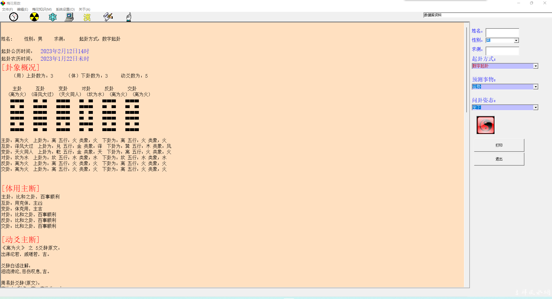 有需要者加微信gn413168 售价:100元 适用于windows系统winxp/win7/win8/win11 -------------------------------------------------------------------------------------------------------------- 《梅花易数》(版本:2.3) 发扬周易精粹,揭示预测真谛! ----------------------------------------------------------------------------------------------------------- 一.软件简介 “梅花易数”是由文王八卦衍变而来的,以邵康节为代表,由于它可以用时间,方位,笔画,长度, 声音,颜色,数理,象义等起卦 ,极为方便,自古以来就受到了人们的重视而用于各种预测! 《梅花易数》正是以邵氏理论为根本原理,同时参考了张氏的思想,周易原著及多部相关预测学丛书, 再结合实际编写而成,可用于学习研究,实际预测! 它与传统的预测软件有着本质的区别:它不仅能够预测出事情的发展方向,事物的各种状态,更趋向于 导人向善,通过为人处世来达到趋吉避凶的目的,这正是周易的本原,也是周易预测的真谛所在! 二.主要有以下强大的功能: 1.支持多种不同的起卦方法,如:时间起卦,数字起卦,随机起卦,汉字起卦(测字),铜钱起卦,自定义起卦 选择一种方式起卦后,将会自动算出主卦,互卦,变卦,对卦,反卦,交卦,及其上下卦数,动爻数, 五行属性,所属类象,并自动区分体用! 2.独创“事件起卦”技术,只要输入一个表达一件事情的句子,将会自动分析出关键词来起卦,绝对智能! 3.具有强大的数据库查询管理功能,能够将所起卦象保存到数据库,以便以后的查询与归类研究! 4.支持多种问卦姿态的预测,并能根据问卦姿态的不同自动算出应验之期! 5.支持多种不同的断卦方法,如:体用断卦,动爻断卦,卦象断卦,数理断卦! 6.能够预测众多的事物:运势,事业,婚恋,失物,交易,求名,求财,出行,行人,疾病,官讼,决策..... 7.允许自定义上下卦数及动爻数,主要用于以长度,声音,颜色.....等方式起卦。 三.使用方法 注册软件=》选择一种要预测的事物=》选择你想要的问卦姿态=》选择一种方式来起卦=》起卦或断卦 -------------------------------------------------------------------------------------------------------- 其本质是五行的相生相克,要结合实际情况才能提高准确率! 如果在使用过程中出现什么问题或有什么好的建议,欢迎向作者提出!!! 示例 姓名: 性别:男 求测: 起卦方式:数字起卦 起卦公历时间: 2023年2月12日14时 起卦农历时间: 2023年1月22日未时 [卦象概况] (用)上卦数为:3 (体)下卦数为:3 动爻数为:5 主卦 互卦 变卦 对卦 反卦 交卦 (离为火) (泽风大过) (天火同人) (坎为水) (离为火) (离为火) ▅▅▅ ▅ ▅ ▅▅▅ ▅ ▅ ▅▅▅ ▅▅▅ ▅ ▅ ▅▅▅ ▅▅▅ ▅▅▅ ▅ ▅ ▅ ▅ ▅▅▅ ▅▅▅ ▅▅▅ ▅ ▅ ▅▅▅ ▅▅▅ ▅▅▅ ▅▅▅ ▅▅▅ ▅ ▅ ▅▅▅ ▅▅▅ ▅ ▅ ▅▅▅ ▅ ▅ ▅▅▅ ▅ ▅ ▅ ▅ ▅▅▅ ▅ ▅ ▅▅▅ ▅ ▅ ▅▅▅ ▅▅▅ 主卦:离为火 上卦为:离 五行:火 类象:火 下卦为:离 五行:火 类象:火 互卦:泽风大过 上卦为:兑 五行:金 类象:泽 下卦为:巽 五行:木 类象:风 变卦:天火同人 上卦为:乾 五行:金 类象:天 下卦为:离 五行:火 类象:火 对卦:坎为水 上卦为:坎 五行:水 类象:水 下卦为:坎 五行:水 类象:水 反卦:离为火 上卦为:离 五行:火 类象:火 下卦为:离 五行:火 类象:火 交卦:离为火 上卦为:离 五行:火 类象:火 下卦为:离 五行:火 类象:火 [体用主断] 主卦:比和之卦,百事顺利 互卦:用克体,主凶 变卦:体克用,主吉 对卦:比和之卦,百事顺利 反卦:比和之卦,百事顺利 交卦:比和之卦,百事顺利 [动爻主断] 《离为火》 之 5爻辞原文: 出涕沱若,戚嗟若,吉。 爻辞白话注解: 泪流滂沱,悲伤叹息,吉。 周易卦爻辞(原文): 离为火:利贞,亨,畜牝牛,吉。 彖曰:离,丽也;日月丽乎天,百谷草木丽乎土,重明以丽乎正,乃化成天下。 柔丽乎中正,故亨;是以畜牝牛吉也。 象曰:明两作离,大人以继明照于四方。 初九:履错然敬之,无咎。 象曰:履错之敬,以辟咎也。 六二:黄离,元吉。 象曰:黄离元吉,得中道也。 九三:日昃之离,不鼓缶而歌,则大耋之嗟。凶。 象曰:日昃之离,何可久也。 九四:突如其来如、焚如、死如、弃如。 象曰:突如其来如,无所容也。 六五:出涕沱若,戚嗟若。吉。 象曰:六五之吉,离王公也。 上九:王用出征,有嘉折首,获匪其丑。无咎。 象曰:王用出征,以正邦也。 周易卦爻辞(解释): 【古经】离,利于守正,亨通。畜养母牛,吉。 初九:行礼开始即应崇敬,无灾咎。 六二:黄色罗网(捕捉禽兽)开始即吉。 九三:日斜张网(捉禽兽),不敲击而唱歌,老人发出叹息,凶。 九四:被逐的不孝之子返回,(人们将他)焚烧、治死、抛弃。 六五:泪如雨下,忧戚叹息,吉。 上九:君王用兵出征,有令嘉奖折服首恶者。执获的(俘虏)不是一般随从者,(故而)无咎。 【彖传】丽:依附。土:一本作“地”,案《易传》多以天地相称,故作“地”为胜。重明以丽乎正:《离》卦上下皆为离离,离为明,故曰“重明”,内卦三爻皆得正位,故曰正。此是说外卦重明依附于内卦之正。柔丽乎中正:《离》卦六二、、六五居中,六二得正。畜牝牛吉:畜养母牛得吉。牝,母。 【象传】明两作:《离》卦上下皆离。离为明,故“明两作”,即《彖》所谓“重明”。作,起。继明:连续不绝的光明。履错:行礼开始。履,礼。错,帛《易》作“昔”,指开始。以辟咎:初九以阳居明之初,象日出而升,当以恭敬则可避免灾咎。辟,避。黄离:用黄色网猎取禽兽。得中道: