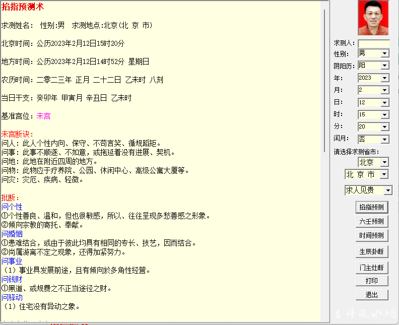 适用于windows系统winxp/win7/win8/win11 有需要者加微信gn413168 程序简介: 现今社会形态,由于工商业的极度发达所致,因此,造成人们在生活上的脚步,或是精神上的状态均呈显一种现象。尤其胜负的关键往往只在一念之取舍。因此,如何能先抢得此胜负之关键、预知此制胜之先机,大概就是时下大众最迫切且最需要的秘密武器了。本程序的内容即是针对著如何掌控这制胜关键时机而设计的。希望大家能藉此“掐指神算”的神秘利器,而达成心愿与目标。不论是爱情、事业、钱财、健康、阳宅、阴宅、彩票……等等生活大小之事都可预测。依据气数的“掐指神算”法往往可达到百分之九十八以上的准确度。
