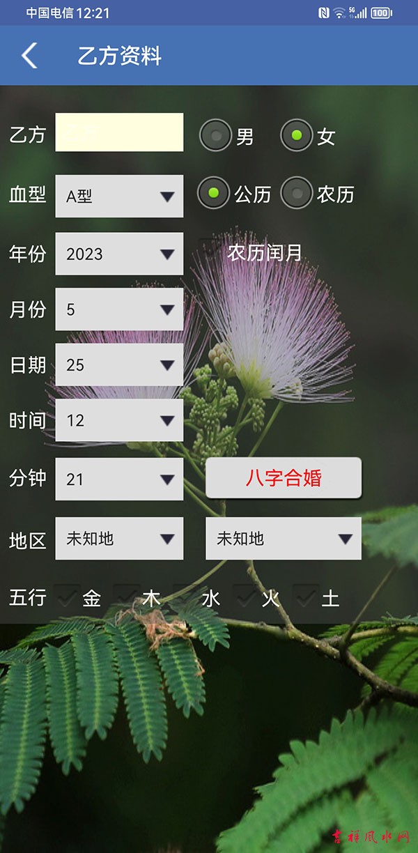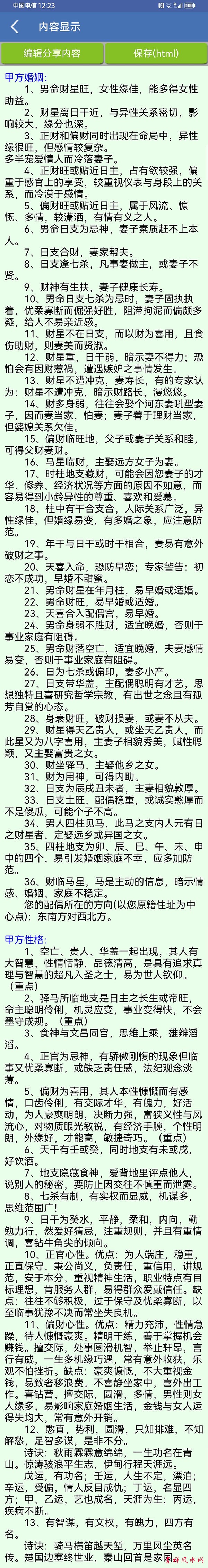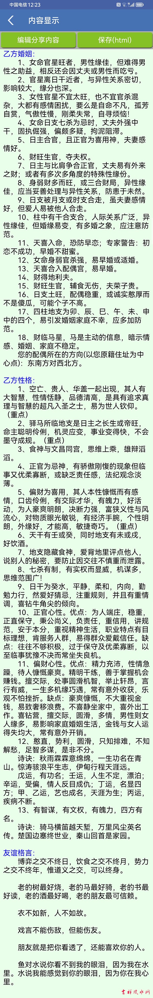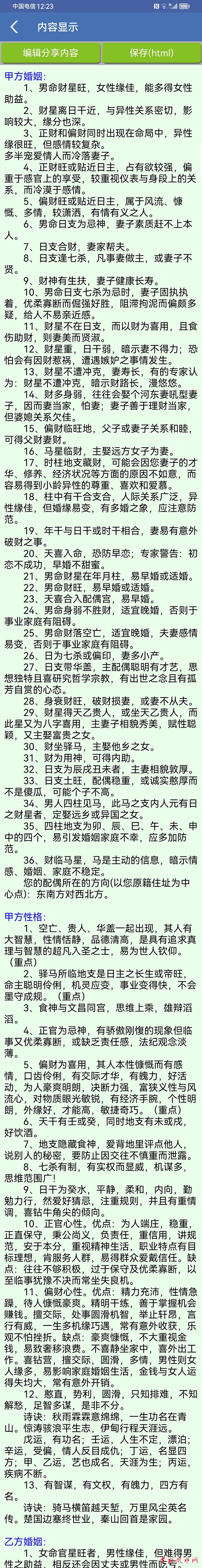 本软件注册费:6年期300元,3年期200元 ,2年期150元,终身版500元 本软件适用于安卓系统、华为鸿蒙系统。 有需要者加微信gn413168 本软件可以处理两个八字的“配婚关系”、“二人关系”。当然,“配婚关系”只适用于异性,“二人关系”包括同性和异性。可通过点击程序首页的“配婚”和“二人”选择测试何种关系。 五行选项是手工定喜用神,如果您不选择,则由程序来判断;如选择了,程序按您的选择运算。 程序处理两个八字的参考因素有:八字五行补救、十神配合、东西四命互配、生肖及四柱刑冲合害、四柱纳音配合、前世因缘(由出生时间算出对应的星宿,再有星宿配合论命)、二人出生年月之配合、星座、血型。 综合以上因素来评分,100分为满分。大于80分者为上等婚,60-80分之间者为中等婚,小于60分者为下等婚。 当然,命理的因素也仅仅是个参考因素,良好美满的婚姻还是要靠每个人努力去经营的。常存善念,不断改正自己的错误,宽宏大量,尊重他人,长此以往,命运自然会改变,婚姻也自然会美满。 在显示八字合婚内容页面里,点击手机“MENU”按钮,会弹出菜单,分别有“造命篇”、“八字知识”等内容。" 每次点击“八字合婚”按钮后,程序会自动保存合婚内容到BaziHehun.html文件,此文件位于您手机存储卡nfdata文件夹里。您可以重命名此文件。这是浏览器格式文件,您可将此文件拷贝到电脑里,用IE等浏览器打开,然后可将内容拷贝到WORD等编辑器里编辑。 |