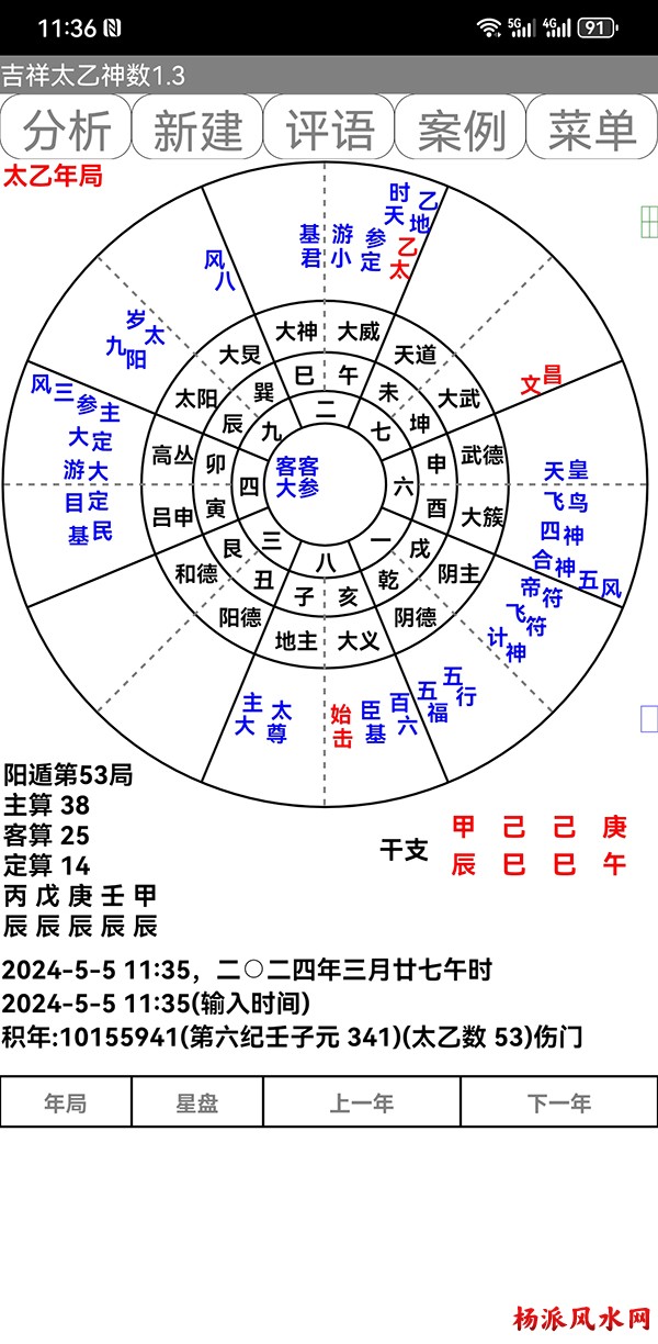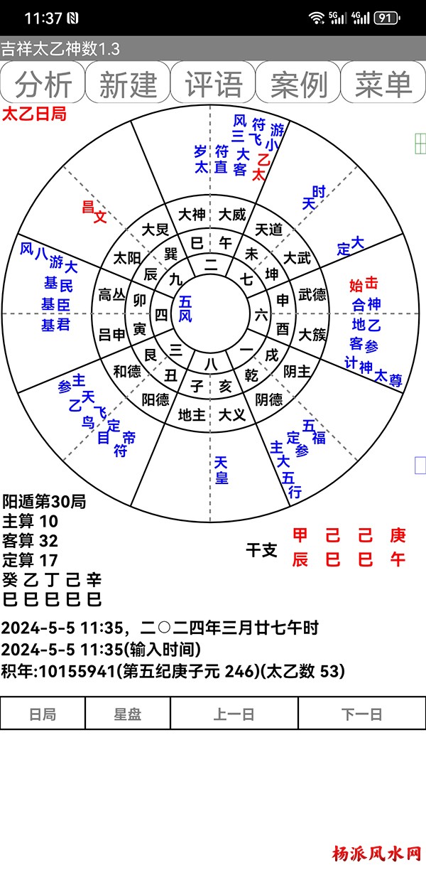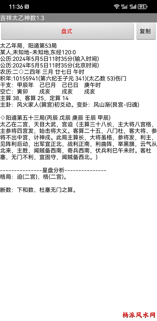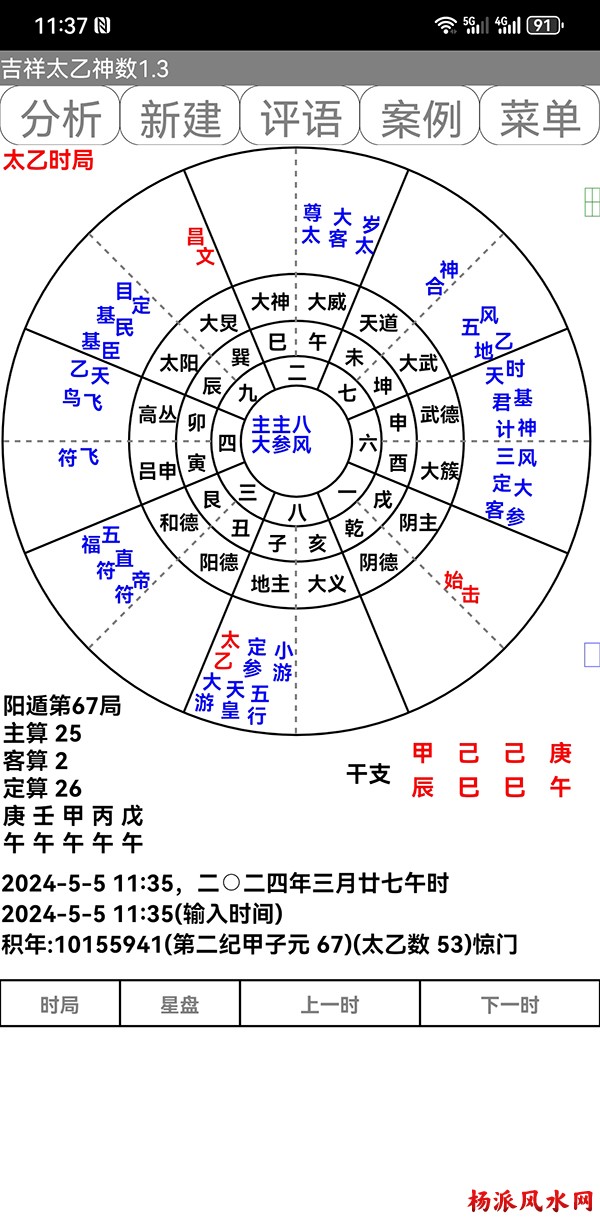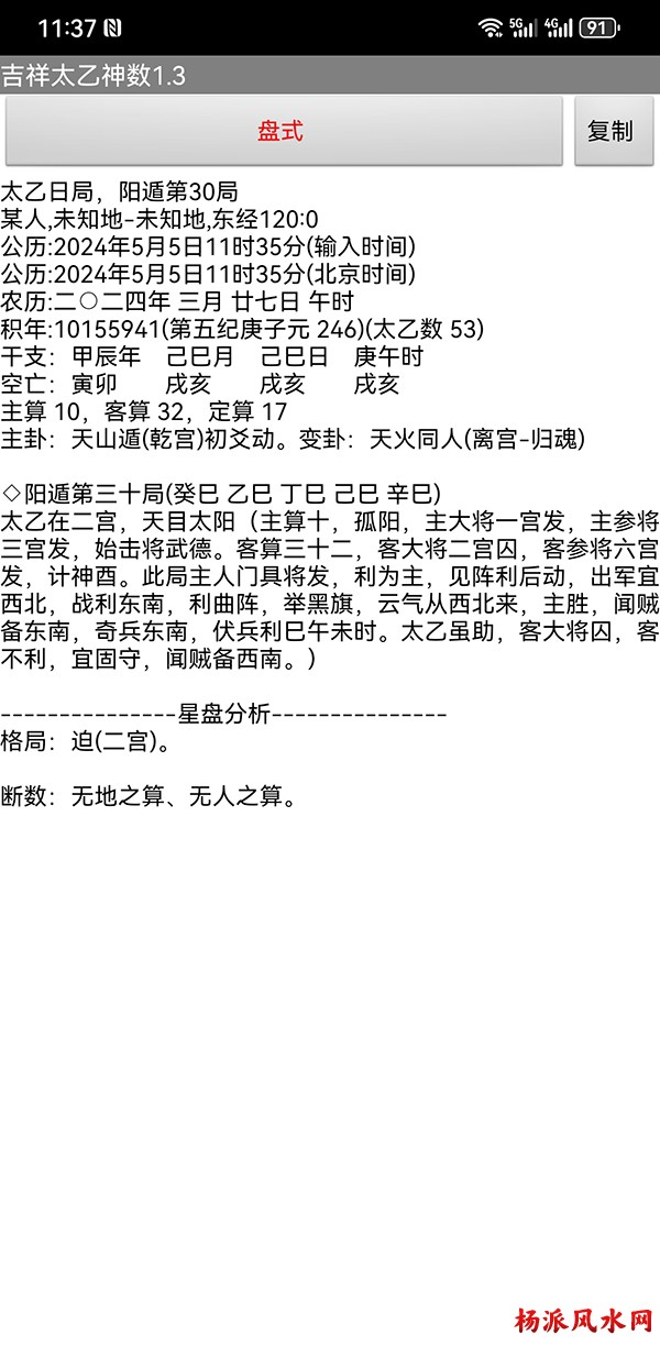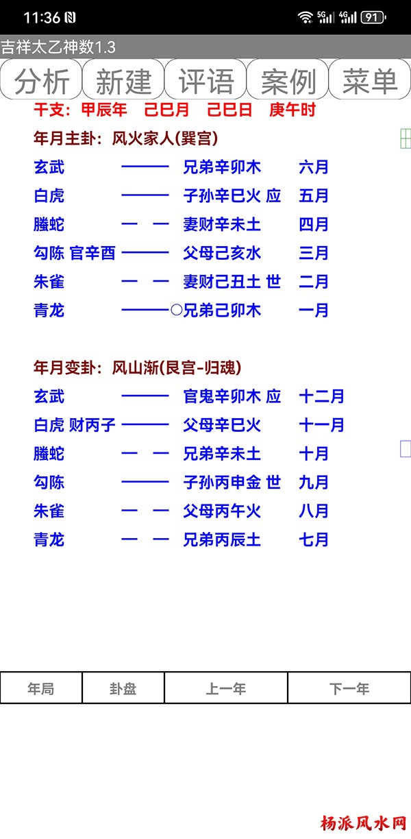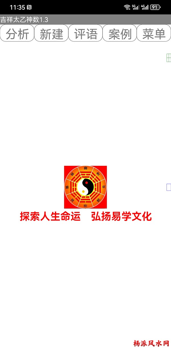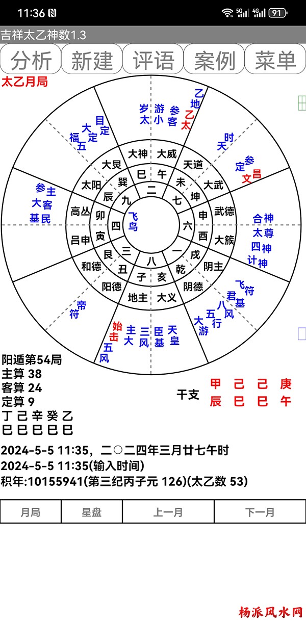 有需要加微信 gn413168 软件说明: 1:运行环境:安卓系统/鸿蒙系统 2:本软件为绿色软件,安装软件时只完成复制,卸载时直接删除,不会往你的系统文件夹拷入文件,不会 修改注册表,请放心使用,不带任何插件。 3:本软件为共享软件,未注册有功能限制,但没有时间限制。注册后你可以使用所有功能,并且享受软件 日后的免费升级,和使用时作者亲自提供的技术支持。 4:你可以分发、传播这个软件,但作者保持对软件的所有权。请不要对它进行反汇编、破解,谢谢你的合 作。 行生克制化的无穷联系,要灵活变通,不要完全刻板的按照软件给出的断语推断,如果由此造成一切不良后 果,由使用者自己负责,作者将不承担任何责任。 ============================================================================== ※杨派太乙神数 V1.3.1※ 2024.05.05更新 太乙号称“三式”之首,是一种比遁甲、六壬更神秘的预测术,理论研究、实际应用方面开发的很 少,本软件可以计算出预测需要的参数,可以绘出年局、月局、日局、时局、命局太乙盘,直观易懂,并显 示预测需要用到的数据,是命理研究者、爱好者的良好辅助工具。 一:使用帮助: 1:输入出生时间,公、农历在 -4713到9999年,合计 15000年。 2:选择预测地、选择预测人性别、输入姓名等。 3:选择盘式。 4:点按钮“排盘”就可排出一张太乙盘,点按钮“流年盘”可排流年盘(只有选择了 命局排盘,才可以排 流年盘) 几点说明: 1:排太乙命盘、流年盘时,本命盘的星用蓝色、红色表示,流年盘星用绿色、咖啡色表示。 2:几个星名用简称,主大=主大将,主参=主参将,客大=客大将,客参=客参将,定大=定大将,定参=定参 将 3:流年盘星名简称,小六=小限百六,大六=大限百六 相关太乙神数知识,可参考《太乙通解》、《太乙考证》、《太乙淘金歌》、《太乙数统宗大全》、《太乙 金镜式经》、《登坛必究》等书。 ================================================================================ 二:历史记录管理: 1:软件可以保存无限多的案例,并可以方便地查找、编辑、修改历史记录。 2:记录管理功能,可在软件左边的命例列表上查看右键菜单。 3:查看历史记录时,如果进行了修改,可以点击“排盘”按钮上方的“存旧”图标,保存修改后的文本。 4:菜单“文件->导出历史记录”可以把当前所有历史记录另存到指定的目录,适用于软件升级时保存旧版 本的记录(导出的记录,可以在安装后的新版软件重新导入) 5:菜单“文件->导入历史记录”可以把导出的历史记录重新加入现在的软件,使用此功能,将先清除现有 的记录。(此功能可以把旧版本的软件的历史记录导入) 6:菜单“文件->整理记录文件”将优化现有记录文件,读取提高速度。 7:软件启动时,只显示最近保存的最多 1000个案例,如果要显示全部或者查找指定类别,可以按鼠标右键 ,执行对应功能。 |