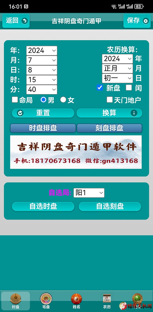 新版安卓阴盘奇门遁甲软件,是手机上的阴盘奇门排盘软件内有时盘排盘、刻盘排盘、山向奇门排盘、阴盘奇门宅盘、移星换斗、姓名排盘、周易万年历等功能。有需要联系微信gn413168 ... ... ... ...