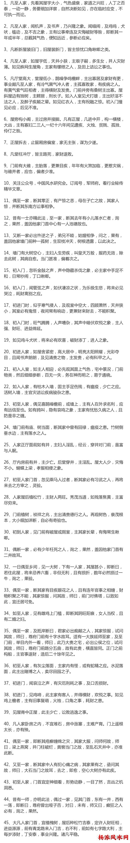 住宅风水吉凶 1、凭什么知道人家贫穷又贫穷? 看到人家住地的山脉走势歪斜、水路流来又折回。 2、凭什么知道人家富足又富足? 看到周围众多的圆头山峰都朝护其屋宅便明白了。 3、凭什么知道人家显贵又显贵? 看其屋前案山笔直秀挺的山峰拔地而起就知道了。 4、凭什么知道人家出富豪? 看其住宅山势一山更比一山高就知道了。 5、凭什么知道人家到了破败的时候? 看其住地山势一山更比一山低就知道了? 6、凭什么知道人家要出孤儿寡妇? 看其屋侧山岗如扇,孤独峰峦歪斜就知道了。 7、凭什么知道人家少年短命早夭? 看他屋前屋后都有塘就知道了。 8、凭什么知道人家吊颈死? 看其屋前两侧山的山腰均有条路就知道了。 9、凭什么知道人家少子孙? 看其坟地前后两边地势高过其祖坟就知道了。 10、凭什么知道人家二姓同居? 看其屋宅一边有山而另一边却没有就知道了。 11、凭什么知道人家主人离乡在外? 看其屋前有一山主脉伸过明堂就知道了。 12、凭什么知道人家出门去当兵? 看那如枪山岗在其屋前延伸就知道了。 13、凭什么知道人家被贼偷? 其住地一山脉延伸出去,而另一山脉势弯曲如钩。 14、凭什么知道人家家中出了忤逆子孙? 看其屋侧龙虎两山相斗或开口就知道了。 15、凭什么知道人家被火烧? 看其屋宅四周山脚似芭蕉就知道了。 16、凭什么知道人家女儿淫乱? 看其门口正对坑洼、有水流去又折返就知道了。 17、凭什么知道人家时常发哭声? 看其宅前有个鬼神屋就知道了。 18、凭什么知道人家不旺财? 看其屋前没有活水流来就知道了。 19、凭什么知道人家命不长? 看其住宅处青龙、白虎缺一边就知道了。 20、凭什么知道人家挨受孤处独宿居? 看其屋前有水流过明堂状似簸箕就知道了。 21、凭什么知道人家修善果? 看其屋前有个香炉山就知道了。 22、凭什么知道人家会做法师? 看其住处排符山就知道了。 23、凭什么知道人家出有跛足人? 看其屋前屋后的圆头山都傍着尖头山就知道了。 24、凭什么知道人家招引死神到来? 看那停尸山在其屋前排列就知道了。 25、凭什么知道人家有残疾? 那只因为住处有水流带地下泉水流入。 26、凭什么知道人家宅内少人? 看其屋后山没有充满生气的起伏之势就知道了。 仔细观察住宅周围的山水形势,根据山形地势来判断祸福。 阳宅直口断 开门放水法: 1、子山午向:门宜开在巳方,水放丁、甲、辛方,忌亥、坤方。 2、癸山丁向:门宜开在丙方,水放丙、丁、甲方,忌流巳未方。 3、丑山未向:门宜开在午、酉方,水放庚、丙方,忌流坤申方。 4、艮山坤向:门宜开在申、午方,水宜放坤、丙方,忌庚、丁方。 5、寅山申向:门宜开在申、午方,水宜放干方,忌未、坤、辛方。 6、甲山庚向:门宜开在庚、午方,水宜放庚丁,忌坤申方。 7、卯山酉向:门宜开在申、戌方,水宜放辛方,忌坤乾方。 8、乙山辛向:门宜开在申辛方,水宜放庚辛方,忌戌乾方。 9、辰山戌向:门宜开在戌子方,水宜放癸方,忌坤壬方。 10、巽山乾向:门宜开在戌子乾方,水宜放癸放,忌辛壬方。 11、巳山亥向:门宜开在亥酉方,水宜放癸方,忌乾壬方。 12、丙山壬向:门宜开在亥寅丑方,水宜放壬辛戌方,忌乾艮癸方。 13、午山子向:门宜开在亥方,水宜放癸方,忌乾艮方。 14、丁山癸向:门宜开在癸方,水宜放辛方,忌乾丑艮方。 15、未山丑向:门宜开在寅壬方,水宜放申方,忌艮方。 16、坤山艮向:门宜开在子寅方,水宜放艮方,忌癸申方。 17、申山寅向:门宜开在子寅方,水宜放甲癸方,忌艮方。 18、庚山甲向:门宜开在庚甲方,水宜放甲庚壬方,忌艮巽乙丑方。 19、酉山卯向:门宜开在巳丁丙方,水宜放乙方,忌巽宫和艮方。 20、辛山乙向:门宜开在寅方,水宜放乙丙方,忌艮巽方。 21、戌山辰向:门宜开在寅辰方,水宜放甲乙方,忌巽宫和坤开门放水。 22、乾山巽向:门宜开在卯巳方,水宜放巽甲方,忌乙巳方。 23、亥山巳向:门宜开在巳丙卯方,水宜放丁方,忌巽坤方。 24、壬山丙向:门宜开在丙巳丁方,水宜放丁方,忌巽申坤方。 院子出水口之吉凶断法: 丙巳交界出水:易患食道癌。 丁未交界出水:吐血痨伤。 巽卦方位出水:肝肺病、嗓子病、喘咳。 乙辰交界出水:易出邪象、长女吐血、出痨伤眼或出瞎子。 甲寅交界出水:易患疯瘫、皮肤精神病。 癸丑交界出水:主吐血泻血精血不调、出大胆之人、月事不调。 亥壬交界出水:对小口不利主凶出夜啼。 庚申交界出水:出盗匪、庚多主抡劫、申多出大盗。 卯单卦方出水:水主有财无主出瞎子。 乾卦方位出水:主出文昌大寿之人。 辛戌交界出水:出美人和旺横财。 丙山方位出水:主出文昌、丁财两旺。 艮寅交界出水:发财,主出医生星相之人。 辛酉交界出水:出美女。 丙丁交界出水:丁财两旺文昌强。 阳宅八方坑坎吉凶: 丑方低洼,主家人当兵惨死战阵中。 艮方低洼,主出乐师巫师残疾患人。 寅方坑凹,主遭逢狼伤及虎咬。 甲方坑凹,主外死他乡难归家。 卯方有水坑,主伤眼目。 乙辰方有水,主患秃疯。 巽方有坑洼,主打官司必定败,阳气不足阴山出暗风。 午丙方有坑,主火灾频频发。 未丁方低凹,家主出痨病咳嗽人。 酉方低凹,主家境贫寒又窘迫。 戌亥方低洼,形如蛇腰主常遭邪鬼盗贼侵。 壬子方低洼,有弯主香火断绝无后嗣。 阳宅住宅外形吉凶 阳宅的来龙的地势要有气脉,选用宽阔平坦的地方。其明堂要宽敞,厅堂门的位置应先