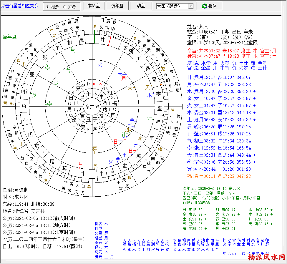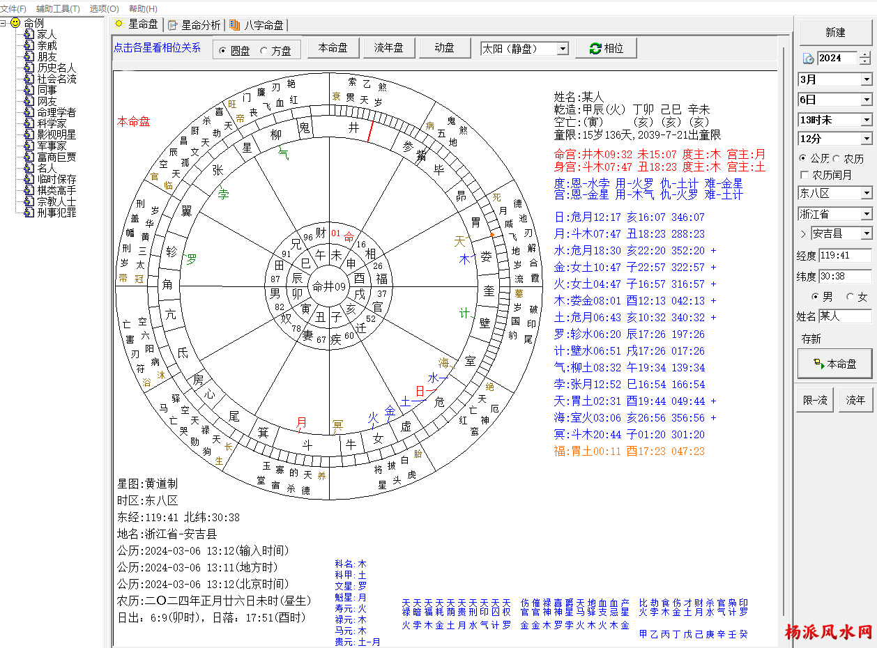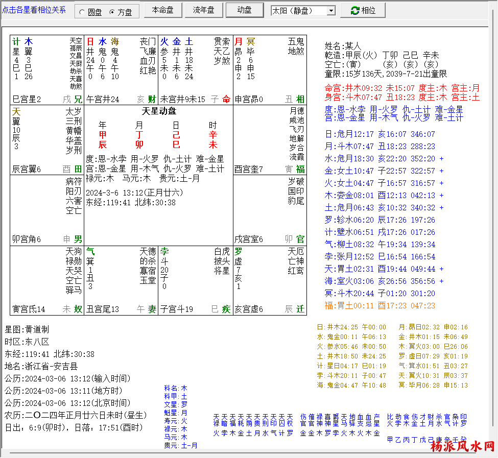 需要软件的加我微信gn413168 软件说明: 1:运行环境:win9x\winme\win2K\winXp\Vista\Win7\win8\win10\win11 2:本软件为绿色软件,安装软件时只完成复制,卸载时直接删除,不会往你的系统文件夹拷入文件,不会 修改注册表,请放心使用,不带任何插件。 3:本软件为共享软件,未注册有功能限制,但没有时间限制。注册后你可以使用所有功能,并且享受软件 日后的免费升级,和使用时作者亲自提供的技术支持。 4:你可以分发、传播这个软件,但作者保持对软件的所有权。请不要对它进行反汇编、破解,谢谢你的合 作。 5:作为一款专业的命理软件,它能求得星命所需的任何参数。但是应该知道周易的灵魂在于阴阳、五行生 克制化的无穷联系,要灵活变通,不要完全刻板的按照软件给出的断语推断,如果由此造成一切不良后果 ,由使用者自己负责,作者将不承担任何责任。 ============================================================================== ※七政星命 ※ 中国星命术,源远流长,最早可上朔至唐代。一代宗师张果著成《张果星宗》,用日、月、五星、四余 的关系来预测人的一生命运,本软件能根据出生时间排出星图,所有的星位关系在图上一目了然,使用专 业的天文计算方法,求得的星体位置达到了很高的精度,是了解、研究易学的良好工具。 使用帮助: 1:输入出生时间,公、农历在1600-2200。 2:设定时区,国内用北京时间(就是东八区,软件默认为这个区),一般可以不用改。 3:选择出生地以快速输入经纬度,也可直接输入经纬度。东经为正、西经为负,北纬为正、南纬为负。 比如东经117度48分、北纬25度42分,就输入 经=117:48 纬=25:42 比如西经117度48分、南纬25度42分,就输入 经=-117:48 纬=-25:42 4:点按钮“本命盘”就可排出一张本命盘,点按钮“限-流”或者“流年”可排流年盘。 其他星命知识,可参考《星度指南》《星平会海全书》、《星学大成》、《张果星宗大全》、《天步真原 》、《古今七政占星速成》、《古今七政五余析义》、《天星择日实务》、《天星择日精义》等书。 相关说明: 1:日出、日落时间都是真太阳时。 2:星后面的 + 指顺行,- 指逆行。 3:点击各星可以看相位关系,第一次点击看自身盘各星关系,第二次点击看和其他盘的关系(如果有内外 两个盘),再次点击不显示相位线。 4:里面的岁数都是虚岁,按立春分年。 --------------------------------------------------------------------- ------------------设置选项说明--------------------------------------- 一:财星简称:才、财,是指偏财=才,正财=财。 财、才,是指偏财=财,正财=才。 二:子时计算,有4种方式,针对23点 - 0点的子时特别处理,0点 到 1点的子时自然算入当日。 1:明日明时,日柱按第二日算,时柱按第二日子时算(时干随日遁)。(建议用此项)(不区分夜、早子 时) 2:明日今时,日柱按第二日算,时柱按今日子时算。 3:今日明时,日柱按今日算,时柱按明日子时算。(也就是常说的区分夜、早子时) 4:今日今时,日柱按今日算,时柱按今日子时算(时干随日遁)。 三:大运计算 1:公历精算,出生公历日期 + 起运年-月-日,得出精确起运时间。起运岁数 = 精确起运年 - 出生年。 (都用节气定年份、月日公历) 2:农历精算,出生农历日期 + 起运年-月-日,得出精确起运时间。起运岁数 = 精确起运年 - 出生年。 (都用节气定年份、月日农历) 3:民间简算,出生日到节入间隔天数,4天内,算一岁起运,5天起过3天加1岁,精度只到年。(用节气定 年) 4:盲派起运:参考盲派书籍。 四:童限计算方式 1:精确:出生日起加上童限行运的具体时间,计算到年-月-日,得到出童限的具体时间。岁数=这个时间 的年份 - 出生日的年份 + 1。(用节气定年,岁数用虚岁) 2:粗算:出生日加上童限行运的年数,得到出童限年的立春时间,做为出童限的具体时间。岁数=这个时 间的年份 - 出生日的年份 + 1。(用节气定年,岁数用虚岁) 3:旧版:按之前老版星命软件的计算方式。 ----------------------------------------------------------------------- 三:历史记录管理 1:软件可以保存无限多的命例,并可以方便地查找、编辑、修改历史记录。 2:记录管理功能,可在软件左边的命例列表上查看右键菜单。 3:查看历史记录时,如果进行了修改,可以点击“排八字”按钮上方的“存旧”图标,保存修改后的文本 。 4:菜单“文件->备份案例数据”可以把当前所有历史记录另存到指定的目录,适用于软件升级时保存旧版 本的记录(导出的记录,可以在安装后的新版软件重新导入) 5:菜单“文件->还原案例数据”可以把导出的历史记录重新加入现在的软件,使用此功能,将先清除现有 的记录。(此功能可以把旧版本的软件的历史记录导入) 6:菜单“文件->整理记录”将优化现有记录文件,读取提高速度。 7:软件启动时,只显示最近保存的最多 1000个案例,如果要显示全部或者查找指定类别,可以按鼠标右 键,执行对应功能。 8:文本案例(可以和安卓版八字软件互相导入-导出,共享案例,姓名相同的命例无法导入) 【导入生日文件(单个)】 【导入生日文件(多个)】 可以导入如这样格式的文本文件,一行一个命例,用于快速建立案例命库,文件名就是类别名。格式是 这样:“张三 男 2012-10-6-10:12 北京市-朝阳区"。(生日是公历,姓名、性别、生日、地址用空格隔 开,可以不输入地址) 【导出生日文件】 可以把软件里面的所有案例按一个类别一个文件,全部导出,格式如上。 说明:导入的文