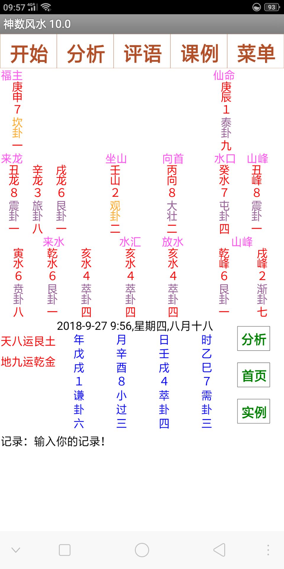 售价:186元 有需要者加微信gn413168 三元风水是道教占验派风水术,是杨公师徒经过实践验证的救贫风水术,能预知风水的吉凶成败,发谁败谁,何时发?何时败? 我们复验古坟名宅,核对校验数据,验证真假,现代称为实战派,与江湖派和书房派不同。 我们致力于将风水术简单化、智能化、精准化,准确测量数据后,排盘一查,就可验证风水的吉凶成败。 九天玄女阴阳法,三元气运心中记,罗盘一测有主张,吉凶祸福如神断。 神数风水10.0精简了主版面,增加了实例验证功能。 龙穴山水坐向为地运,葬课及奇门外应为天运,仙命年庚八字为人运。 阳宅些子法512盘,用于鉴定阳宅的宅命旺衰,及吉凶布局调整。 查找吉课功能及说明。 快速查出玄空大卦六大格局的大吉课。 日课版面增加了上一日下一日与上一时下一时的功能,更加方便好用。 点坐山卦名能打开卦象分析及抽爻换像的功能,查坐山卦对子孙后代福荫力的大小,发谁与不发谁。 新增实例验证功能,对应输入数据,推算风水的吉凶成败,发谁败谁,何时发?何时败? 正确测量数据才有准确的结果,切勿为套数据而测量就偏。有龙配龙,没龙配水,没水造局,正神到山,零神到水,一招造发自家人。 入首龙、坐山、朝向、水口、山峰为主角,来水、山峰、乐山、放水为配角。 来龙入首、来水、去水,放水口,山峰,乐山,来路,去路等数据,有则测,没有不测。有测输入,没有则选未知。 龙山向水峰符合三元风水二十四大局,又当运得气,就可立保证书,保证发富出贵。 福主可输入一至九个年命,仙命可输入一至三个年命。 输入框:年命与年命之间用+号或空格来分别输入。 点击黄色的卦名可打开对应的信息。 |