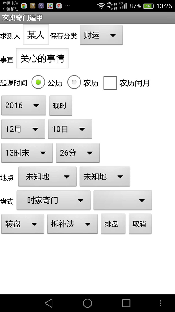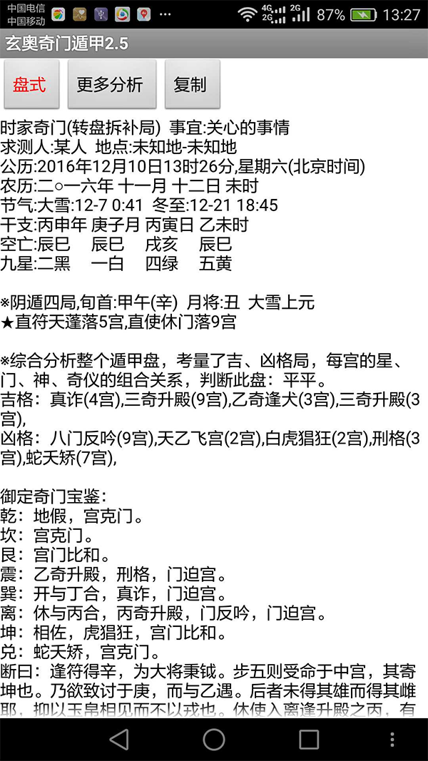 适用于安卓系统使用,鸿蒙系统使用 有需要者加微信gn413168 最新版本 2.6 运行环境:Android 系统 开发工具:Eclipse 软件介绍: 奇门遁甲-神秘的帝王之学,中国历史上的名人像黄帝、姜子牙、张良、诸葛亮、刘伯温等都把此术运用于行军作战,从而建立了盖世奇功。奇门遁甲做为易学高层次的预测术,为三式绝学之一,具有神奇的预测功能。本软件不但能完成奇门的排盘功能,还有一定的智能分析功能,具体有以下几大功能: 1:支持时家、日家、月家、年家、飞宫小奇门、阴盘时家、阴盘刻家、刻家奇门共8种奇门预测法。 2:详细解析奇门八宫的门、神、星、奇仪的意义和组合关系。 3:提供权威的《御定奇门宝鉴》以供预测时参考。 4:全面的排盘设置功能,可以用拆补法、超接置闰法、茅山法起局,可排转盘、飞宫两种盘式,等等还有其他一些派别使用的特殊选项,都可以自行设置成符合自己的排法。 5:分类保存无限多的历史事例,并可自由编辑,便于总结历史案例,提高预测水平。 使用安装问题: 1:软件运行平台:Android系统,最好是HVGA(320x480)的屏幕。 2:把“QiMen”这个文件拷贝到手机储存卡上,然后运行手机里的“文件浏览器”找到传过去的文件,点击运行,就可以开始安装了。 提示:如果无法安装,请先把“设置->应用程序”里面的“未知来源”勾上。 3:软件默认把事例数据保存到储存卡上,如果没有储存卡,将保存到手机内存里。(在软件“设置”里可以自行设置保存到储存卡或者手机内存里) 4:软件提供分类保存的功能,可以保存无限多的事例。 |