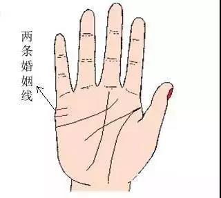 婚姻线又名爱情线、结合线,是观察结婚对象好坏,或者结婚后是否幸福的部位,在水星丘侧(小指根部掌边),感情线上方,所刻划的短短横线,有时出现几条,但以最长最明显的一条为准。 婚姻线深浅代表什么? 婚姻线中出现深长线条的你,多半已和异性有夫妻之实或较亲密的接触,只是缺个婚姻之名,不然也是生理发育已趋成熟,可以进入婚姻状态的象徵,万事俱备的情况下,只待自己做好心理準备,愿意对自己一声令下,要结婚不是问题。 婚姻线浅薄,是婚姻不太成熟的象徵,对爱情不太关心或追求异性缺少耐心,不然就是和异性仅仅处于爱慕,以及生理发育尚未完全的状态,因此往往迟婚,这种手相的你,不论在心理生理上,想婚须更培养家庭的责任心和概念,以及担当的能力喔。 没有婚姻线预示着什么? 1、异性缘较差 有两条婚姻线预示什么? 1.两条平行的婚姻线 小指末端至感情线之间,有两条婚姻线,并且双手都有这个现象的人,一般都被视为婚姻比较曲折的人,长期分居后重聚的也有可能归为此类型。 但其实婚姻线条数并不代表真正意义上的结婚次数,只要婚姻线红色并且深刻清晰,代表着婚姻健全,具有两条婚姻线而婚姻理想的人占据了相当大的比例,所以在手相学上,两条以上的婚姻线反而是理想型的,是否会有多次婚姻还需结合三大主线,特别是感情线综合判定。 如果有一长一短婚姻线的人,说明这个人的手相婚姻不顺,就算是勉强结婚在一起,也是心里不安逸对方,到最后难免也会离婚,或者夫妻之间要分居状况发生,也有再婚状况发生。