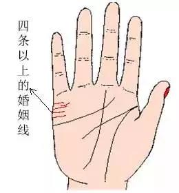 两条婚姻线一长一短且平行,间距紧密表示着这个人已经金屋藏娇或者会发生三角关系。这种人会对异性特别的关注,也很在意掩饰自己,所以桃花也是相当的频繁。 男生有两条婚姻线都很花心? 1、婚姻比较坎坷 2、容易出现三角恋 三条婚姻线预示着什么? 1、代表感情复杂 有三条婚姻线的人,显示此人爱情较为复杂,贞操观念薄弱,是一个很容易对女人或(男人)流于风流和多情。由于这样的人对生活观念较差,所以很多时候会惹来桃色纠纷,但若是运用智慧的话,便可以避免纷争。 如果感情线是锁链纹,上面有很多小分叉,婚姻线有三条以上且形状多样,性欲线由两端伸出,但弧形没有连接起来,这就是个“闷骚大白菜”,如果感情线是锁链纹,上有几条小分叉,婚姻线有两三条,性欲线断断续续,这就是一个“闷骚小白菜”。 有四条婚姻线预示着什么? 1.不满足于平淡的婚姻 有四条或四条以上婚姻线的人,如果婚姻线是细长的,表示这个人有浪漫的性格。有这样婚姻线的女性不会安于平淡,会相继更换男人;有这样婚姻线的男性即使找到了理想的妻子也会拈花惹草。 婚姻线在跟开始的地方就出现破坏的横纹,这代表未结婚时会因为对方花心而出现感情波折,波折大小要视岛纹大小而定。婚姻线的结束地方成下垂并有割断感情线(手掌三条主线中的最上一条线)之势,主感情复杂,容易干涉他人的感情,会成为横刀夺爱的第三者。 婚姻线在四条以上,主享受肉体的乐趣多于精神。男性因为是一个贪欲的好色之徒,所以很难过健全的家庭生活,而在古代女相中有"人尽可夫"之说,据说很多从事色情行业的女性有这类手相。 |