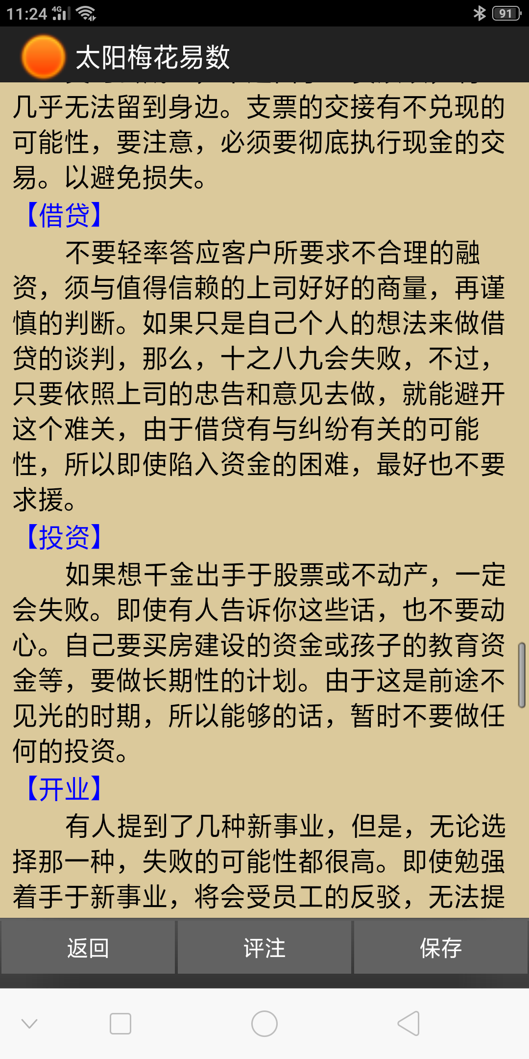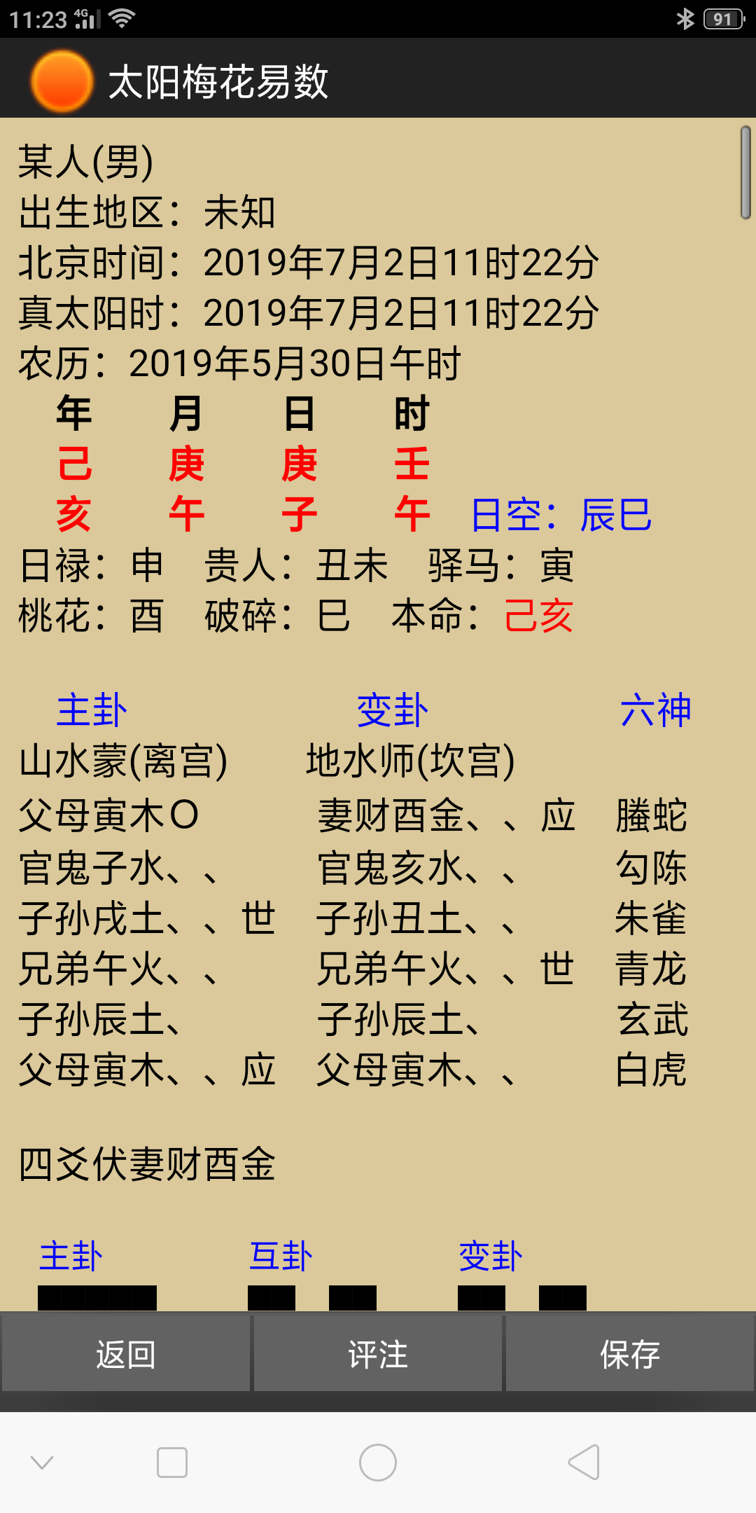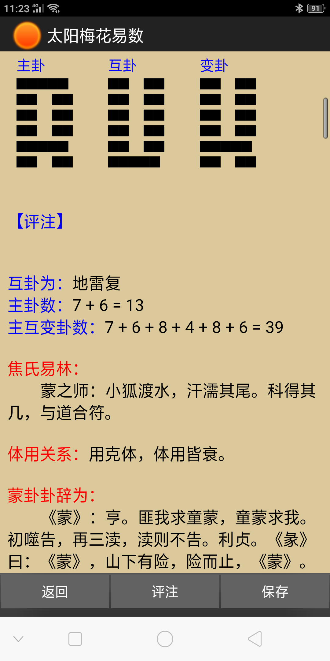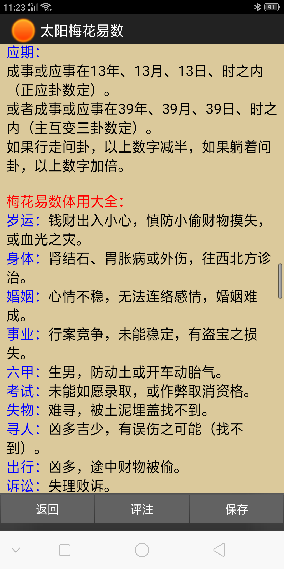 售价:168元 有需要者加微信gn413168 手机梅花易数 V2.15 本软件是手机梅花易数程序android版,android系统V2.1及以上版本手机和平板电脑,都可以安装使用。 本程序共有四个主页面,分别是:【新建梅花卦例】、【卦例显示】、【万年历】、【关于】页。 【新建梅花卦例】页,可根据选定的年月日时和你的基本信息及起卦方法,起出梅花卦来,勾选【保存此盘】按钮,可自动保存当前输入的信息; 【卦例显示】页,可列出保存过的卦例信息,【点击】所选卦例就可以排出卦例来,【长按】所选卦例就会弹出【删除卦例】的确认框,进行课例删除。 【关于】页,提供了【帮助】、【注册】、【分享软件】、【意见反馈】等选项。 每次点击【起卦】按钮后,程序会自动保存河洛日课内容到meihua.html文件,此文件位于您手机存储卡lcddata/meihua/文件夹里。您可以重命名此文件。这是浏览器格式文件,您可将此文件拷贝到电脑里,用IE等浏览器打开,然后可将内容拷贝到WORD等编辑器里编辑。 【内容显示】页,点击【保存】按钮,可保存内容为浏览器格式。点击【评注】按钮 ,可以输入你自己的评语,自动保存,可反复修改。 程序会自动备份保存的卦例文件到sdcard/lcddata/meihua/文件夹里,如果换存储卡或换手机,将lcddata文件夹整个复制到新sdcard里,这样就恢复了所有保存的卦例。 起卦年份介于1882-2030。 |